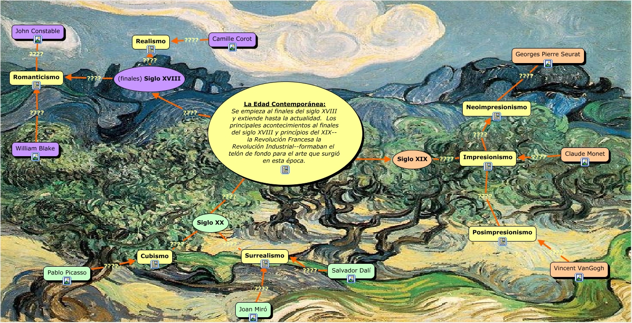 This Concept Map, created with IHMC CmapTools, has information related to: Arte2, Claude Monet ???? Impresionismo, Impresionismo ???? Posimpresionismo, Siglo XX ???? Surrealismo, Georges Pierre Seurat ???? Neoimpresionismo, Siglo XIX ???? Impresionismo, Joan Miró ???? Surrealismo, (finales) Siglo XVIII ???? Romanticismo, La Edad Contemporánea: Se empieza al finales del siglo XVIII y extiende hasta la actualidad. Los principales acontecimientos al finales del siglo XVIII y princípios del XIX-- la Revolución Francesa la Revolución Industrial--formaban el telón de fondo para el arte que surgió en esta época. ???? (finales) Siglo XVIII, Salvador Dalí ???? Surrealismo, John Constable ???? Romanticismo, La Edad Contemporánea: Se empieza al finales del siglo XVIII y extiende hasta la actualidad. Los principales acontecimientos al finales del siglo XVIII y princípios del XIX-- la Revolución Francesa la Revolución Industrial--formaban el telón de fondo para el arte que surgió en esta época. ???? Siglo XX, Pablo Picasso ???? Cubismo, Vincent VanGogh ???? Posimpresionismo, Camille Corot ???? Realismo, La Edad Contemporánea: Se empieza al finales del siglo XVIII y extiende hasta la actualidad. Los principales acontecimientos al finales del siglo XVIII y princípios del XIX-- la Revolución Francesa la Revolución Industrial--formaban el telón de fondo para el arte que surgió en esta época. ???? Siglo XIX, William Blake ???? Romanticismo, Siglo XX ???? Cubismo, Impresionismo ???? Neoimpresionismo, (finales) Siglo XVIII ???? Realismo
