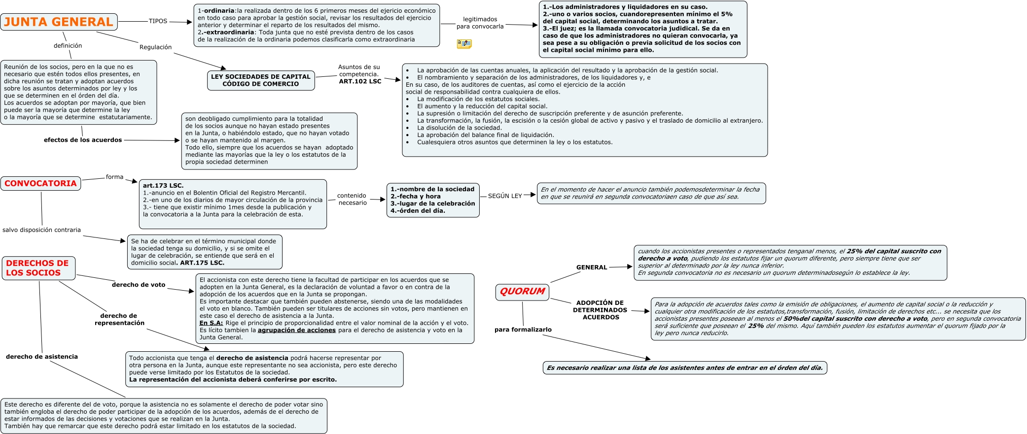 Este Cmap, tiene información relacionada con: FIASCO A L'EMPORIUM, QUORUM ADOPCIÓN DE DETERMINADOS ACUERDOS Para la adopción de acuerdos tales como la emisión de obligaciones, el aumento de capital social o la reducción y cualquier otra modificación de los estatutos,transformación, fusión, limitación de derechos etc... se necesita que los accionistas presentes poseean al menos el 50%del capital suscrito con derecho a voto, pero en segunda convocatoria será suficiente que poseean el 25% del mismo. Aquí también pueden los estatutos aumentar el quorum fijado por la ley pero nunca reducirlo., QUORUM GENERAL cuando los accionistas presentes o representados tenganal menos, el 25% del capital suscrito con derecho a voto, pudiendo los estatutos fijar un quorum diferente, pero siempre tiene que ser superior al determinado por la ley nunca inferior. En segunda convocatoria no es necesario un quorum determinadosegún lo establece la ley., LEY SOCIEDADES DE CAPITAL CÓDIGO DE COMERCIO Asuntos de su competencia. ART.102 LSC • La aprobación de las cuentas anuales, la aplicación del resultado y la aprobación de la gestión social. • El nombramiento y separación de los administradores, de los liquidadores y, e En su caso, de los auditores de cuentas, así como el ejercicio de la acción social de responsabilidad contra cualquiera de ellos. • La modificación de los estatutos sociales. • El aumento y la reducción del capital social. • La supresión o limitación del derecho de suscripción preferente y de asunción preferente. • La transformación, la fusión, la escisión o la cesión global de activo y pasivo y el traslado de domicilio al extranjero. • La disolución de la sociedad. • La aprobación del balance final de liquidación. • Cualesquiera otros asuntos que determinen la ley o los estatutos., CONVOCATORIA forma art.173 LSC. 1.-anuncio en el Bolentin Oficial del Registro Mercantil. 2.-en uno de los diarios de mayor circulación de la provincia 3.- tiene que existir mínimo 1mes desde la publicación y la convocatoria a la Junta para la celebración de esta., JUNTA GENERAL Regulación LEY SOCIEDADES DE CAPITAL CÓDIGO DE COMERCIO, art.173 LSC. 1.-anuncio en el Bolentin Oficial del Registro Mercantil. 2.-en uno de los diarios de mayor circulación de la provincia 3.- tiene que existir mínimo 1mes desde la publicación y la convocatoria a la Junta para la celebración de esta. contenido necesario 1.-nombre de la sociedad 2.-fecha y hora 3.-lugar de la celebración 4.-órden del día., 1-ordinaria:la realizada dentro de los 6 primeros meses del ejericio económico en todo caso para aprobar la gestión social, revisar los resultados del ejercicio anterior y determinar el reparto de los resultados del mismo. 2.-extraordinaria: Toda junta que no esté prevista dentro de los casos de la realización de la ordinaria podemos clasificarla como extraordinaria legitimados para convocarla 1.-Los administradores y liquidadores en su caso. 2.-uno o varios socios, cuandorepresenten mínimo el 5% del capital social, determinando los asuntos a tratar. 3.-El juez; es la llamada convocatoria judidical. Se da en caso de que los administradores no quieran convocarla, ya sea pese a su obligación o previa solicitud de los socios con el capital social mínimo para ello., CONVOCATORIA salvo disposición contraria Se ha de celebrar en el término municipal donde la sociedad tenga su domicilio, y si se omite el lugar de celebración, se entiende que será en el domicilio social. ART.175 LSC., QUORUM para formalizarlo Es necesario realizar una lista de los asistentes antes de entrar en el órden del día., 1.-nombre de la sociedad 2.-fecha y hora 3.-lugar de la celebración 4.-órden del día. SEGÚN LEY En el momento de hacer el anuncio también podemosdeterminar la fecha en que se reunirá en segunda convocatoriaen caso de que así sea., DERECHOS DE LOS SOCIOS derecho de voto El accionista con este derecho tiene la facultad de participar en los acuerdos que se adopten en la Junta General, es la declaración de voluntad a favor o en contra de la adopción de los acuerdos que en la Junta se propongan. Es importante destacar que también pueden abstenerse, siendo una de las modalidades el voto en blanco. También pueden ser titulares de acciones sin votos, pero mantienen en este caso el derecho de asistencia a la Junta. En S.A: Rige el principio de proporcionalidad entre el valor nominal de la acción y el voto. Es lícito tambien la agrupación de acciones para el derecho de asistencia y voto en la Junta General., Reunión de los socios, pero en la que no es necesario que estén todos ellos presentes, en dicha reunión se tratan y adoptan acuerdos sobre los asuntos determinados por ley y los que se determinen en el órden del día. Los acuerdos se adoptan por mayoría, que bien puede ser la mayoría que determine la ley o la mayoría que se determine estatutariamente. efectos de los acuerdos son deobligado cumplimiento para la totalidad de los socios aunque no hayan estado presentes en la Junta, o habiéndolo estado, que no hayan votado o se hayan mantenido al margen. Todo ello, siempre que los acuerdos se hayan adoptado mediante las mayorías que la ley o los estatutos de la propia sociedad determinen, JUNTA GENERAL TIPOS 1-ordinaria:la realizada dentro de los 6 primeros meses del ejericio económico en todo caso para aprobar la gestión social, revisar los resultados del ejercicio anterior y determinar el reparto de los resultados del mismo. 2.-extraordinaria: Toda junta que no esté prevista dentro de los casos de la realización de la ordinaria podemos clasificarla como extraordinaria, JUNTA GENERAL definición Reunión de los socios, pero en la que no es necesario que estén todos ellos presentes, en dicha reunión se tratan y adoptan acuerdos sobre los asuntos determinados por ley y los que se determinen en el órden del día. Los acuerdos se adoptan por mayoría, que bien puede se