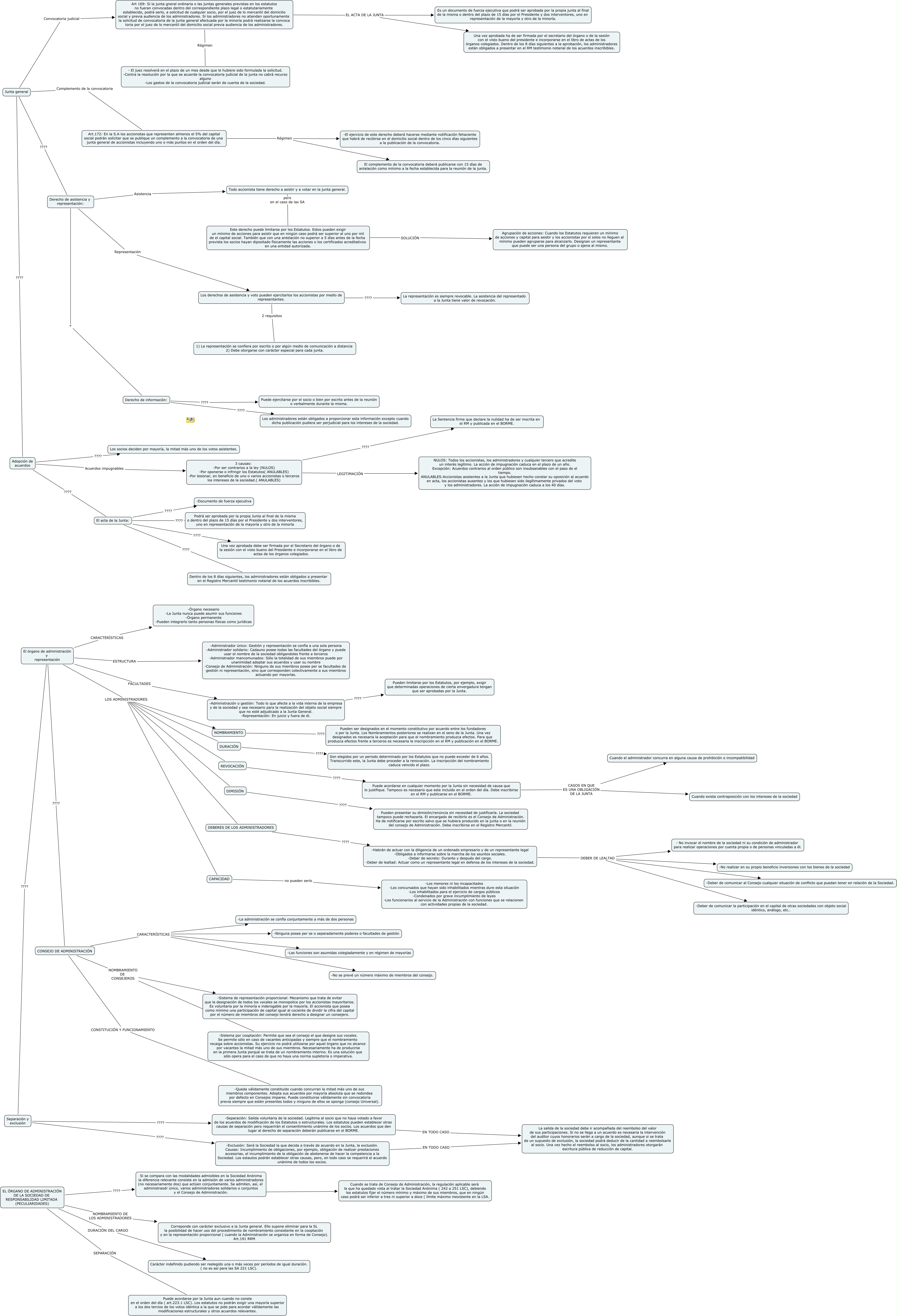 Este Cmap, tiene información relacionada con: escenario 6 mercantil 2, El órgano de administración y representación FACULTADES -Administración o gestión: Todo lo que afecte a la vida interna de la empresa y de la sociedad y sea necesario para la realización del objeto social siempre que no esté adjudicado a la Junta General. -Representación: En juicio y fuera de él., El acta de la Junta: ???? Podrá ser aprobada por la propia Junta al final de la misma o dentro del plazo de 15 días por el Presidente y dos interventores, uno en representación de la mayoría y otro de la minoría, CONSEJO DE ADMINISTRACIÓN CARACTERÍSTICAS -Las funciones son asumidas colegiadamente y en régimen de mayorías, Art 169: Si la junta gneral ordinaria o las juntas generales previstas en los estatutos no fueran convocadas dentro del correspondiente plazo legal o estatutariamente establecido, podrá serlo, a solicitud de cualquier socio, por el juez de lo mercantil del domicilio social y previa audiencia de los administradores. Si los administradores no atienden oportunamente la solicitud de convocatoria de la junta general efectuada por la minoría podrá realizarse la convoca toria por el juez de lo mercantil del domicilio social previa audiencia de los administradores. Régimen - El juez resolverá en el plazo de un mes desde que le hubiere sido formulada la solicitud. -Contra la resolución por la que se acuerde la convocatoria judicial de la junta no cabrá recurso alguno -Los gastos de la convocatoria judicial serán de cuenta de la sociedad., Todo accionista tiene derecho a asistir y a votar en la junta general. pero en el caso de las SA Este derecho puede limitarse por los Estatutos. Estos pueden exigir un mínimo de acciones para asistir que en ningún caso podrá ser superior al uno por mil de el capital social. También que con una antelación no superior a 5 días antes de la fecha prevista los socios hayan dipositado físicamente las acciones o los certificados acreditativos en una entidad autorizada., El órgano de administración y representación ???? CONSEJO DE ADMINISTRACIÓN, Si se compara con las modalidades admisibles en la Sociedad Anónima la diferencia relevante consiste en la admisión de varios administradores (no necesariamente dos) que actúen conjuntamente. Se admiten, así, el administraodr único, varios administradores solidarios o conjuntos y el Consejo de Administración. ???? Cuando se trate de Consejo de Administración, la regulación aplicable será la que ha quedado vista al tratar la Sociedad Anónima ( 242 a 251 LSC), debiendo los estatutos fijar el número mínimo y máximo de sus miembros, que en ningún caso podrá ser inferior a tres ni superior a doce ( límite máximo inexistente en la LSA., DURACIÓN ???? Son elegidos por un periodo determinado por los Estatutos que no puede exceder de 6 años. Transcurrido este, la Junta debe proceder a la renovación. La inscripcción del nombramiento caduca vencido el plazo., -Habrán de actuar con la diligencia de un ordenado empresario y de un representante legal -Obligados a informarse sobre la marcha de los asuntos sociales. -Deber de secreto: Durante y después del cargo. -Deber de lealtad: Actuar como un representante legal en defensa de los intereses de la sociedad. DEBER DE LEALTAD -Deber de comunicar la participación en el capital de otras sociedades con objeto social idéntico, análogo, etc.., El acta de la Junta: ???? -Documento de fuerza ejecutiva, Los derechos de asistencia y voto pueden ejercitarlos los accionistas por medio de representantes. 2 requisitos 1) La representación se confiera por escrito o por algún medio de comunicación a distancia 2) Debe otorgarse con carácter especial para cada junta., Puede acordarse en cualquier momento por la Junta sin necesidad de causa que lo justifique. Tampoco es necesario que este incluído en el orden del día. Debe inscribirse en el RM y publicarse en el BORME. CASOS EN QUE ES UNA OBLIGACIÓN DE LA JUNTA Cuando exista contraposición con los intereses de la sociedad, Separación y exclusión ???? -Separación: Salida voluntaria de la sociedad. Legitima al socio que no haya votado a favor de los acuerdos de modificación de los Estatutos o estructurales. Los estatutos pueden establecer otras causas de separación pero requerirán el consentimiento unánime de los socios. Los acuerdos que den lugar al derecho de separación deberán publicarse en el BORME., CONSEJO DE ADMINISTRACIÓN CARACTERÍSTICAS -Ninguna posee per se o separadamente poderes o facultades de gestión, -Exclusión: Será la Sociedad la que decida a través de acuerdo en la Junta, la exclusión. Causas: Incumplimiento de obligaciones, por ejemplo, obligación de realizar prestaciones accesorias, el incumplimiento de la obligación de abstenerse de hacer la competencia a la Sociedad. Los estautos podrán establecer otras causas, pero, en todo caso se requerirá el acuerdo unánime de todos los socios. EN TODO CASO La salida de la sociedad debe ir acompañada del reembolso del valor de sus participaciones. Si no se llega a un acuerdo es necesaria la intervención del auditor cuyos honorarios serán a cargo de la sociedad, aunque si se trata de un supuesto de exclusión, la sociedad podrá deducir de la cantidad a reembolsarle al socio. Una vez hecho el reembolso al socio, los administradores otorgarán escritura pública de reducción de capital., CONSEJO DE ADMINISTRACIÓN NOMBRAMIENTO DE CONSEJEROS -Sistema por cooptación: Permite que sea el consejo el que designe sus vocales. Se permite sólo en caso de vacantes anticipadas y siempre que el nombramiento recaiga sobre accionistas. Su ejercicio no podrá utilizarse por aquel órgano que no alcance por vacantes la mitad más uno de sus miembros. Necesariamente ha de producirse en la primera Junta porqué se trata de un nombramiento interino. Es una solución que sólo opera para el caso de que no haya una norma supletoria o imperativa., 3 