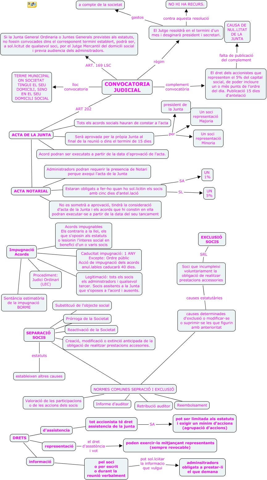 Este Cmap, tiene información relacionada con: Convocatoria Judicial 6, Impugnació Acords ???? Caducitat impugnació: 1 ANY Excepte: Ordre públic Acció de impugnació dels acords anul.lables caducarà 40 dies., ACTA DE LA JUNTA ???? Acord podran ser executats a partir de la data d'aprovació de l'acta., Serà aprovada per la pròpia Junta al final de la reunió o dins el termini de 15 dies per Un soci representació Minoria, SEPARACIÓ SOCIS ???? Prórroga de la Societat, ACTA NOTARIAL ???? Estaran obligats a fer-ho quan ho sol.licitin els socis amb cinc dies d'antel.lació, SEPARACIÓ SOCIS estatuts estableixen altres causes, DRETS ???? representació, El Jutge resoldrà en el termini d'un mes i desginarà president i secretari. contra aquesta resolució NO HI HA RECURS., CONVOCATORIA JUDICIAL ART 202 ACTA DE LA JUNTA, SEPARACIÓ SOCIS ???? NORMES COMUNES SEPRACIÓ I EXCLUSIÓ, ACTA DE LA JUNTA ???? Serà aprovada per la pròpia Junta al final de la reunió o dins el termini de 15 dies, El dret dels accionistes que representen el 5% del capital social, de poder incloure un o més punts de l'ordre del dia. Publicació 15 dies d'antelació falta de publicació del complement CAUSA DE NUL.LITAT DE LA JUNTA, NORMES COMUNES SEPRACIÓ I EXCLUSIÓ ???? Retribució auditor, DRETS ???? d'assistencia, Impugnació Acords ???? Acords impugnables Els contraris a la llei, els que s'oposin als estatuts o lesionin l'interes social en benefici d'un o varis socis, NORMES COMUNES SEPRACIÓ I EXCLUSIÓ ???? Valoració de les participacions o de les accions dels socis, Impugnació Acords ???? Procediment: Judici Ordinari (LEC), CONVOCATORIA JUDICIAL règim El Jutge resoldrà en el termini d'un mes i desginarà president i secretari., SEPARACIÓ SOCIS ???? Creació, modificació o extinció anticipada de la obligació de realitzar prestacions accesories., ACTA DE LA JUNTA ???? Tots els acords socials hauran de constar a l'acta