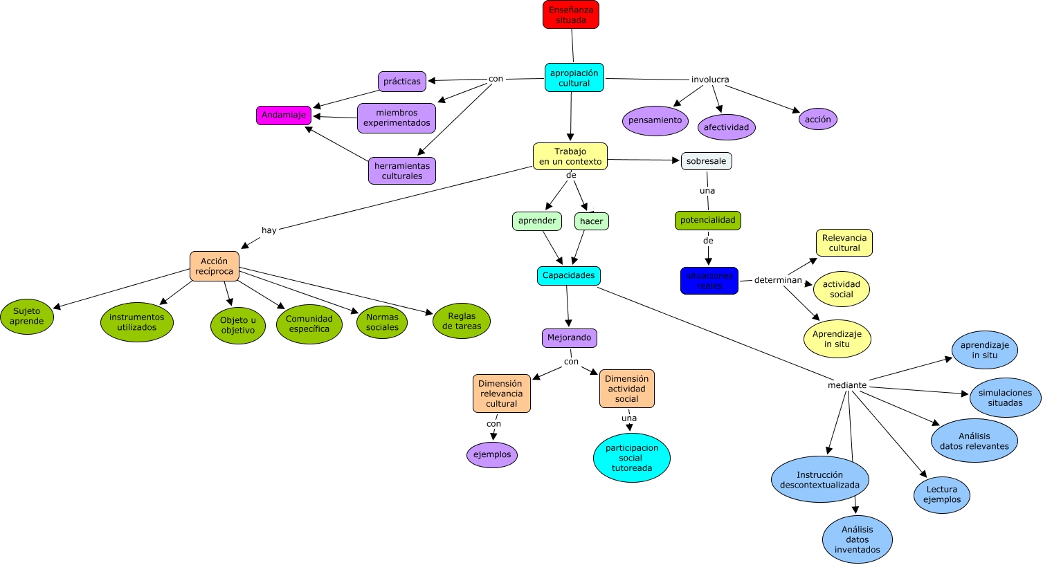 Este Cmap, tiene información relacionada con: Enseñanza situada, apropiación cultural con herramientas culturales, apropiación cultural involucra pensamiento, Capacidades mediante Lectura ejemplos, Acción recíproca ???? instrumentos utilizados, Trabajo en un contexto de hacer, Acción recíproca ???? Normas sociales, apropiación cultural con miembros experimentados, prácticas ???? Andamiaje, Acción recíproca ???? Sujeto aprende, herramientas culturales ???? Andamiaje, Acción recíproca ???? Reglas de tareas, hacer ???? Capacidades, situaciones reales determinan Aprendizaje in situ, apropiación cultural involucra afectividad, apropiación cultural con prácticas, Capacidades ???? Mejorando, miembros experimentados ???? Andamiaje, sobresale una potencialidad, Capacidades mediante simulaciones situadas, situaciones reales determinan actividad social
