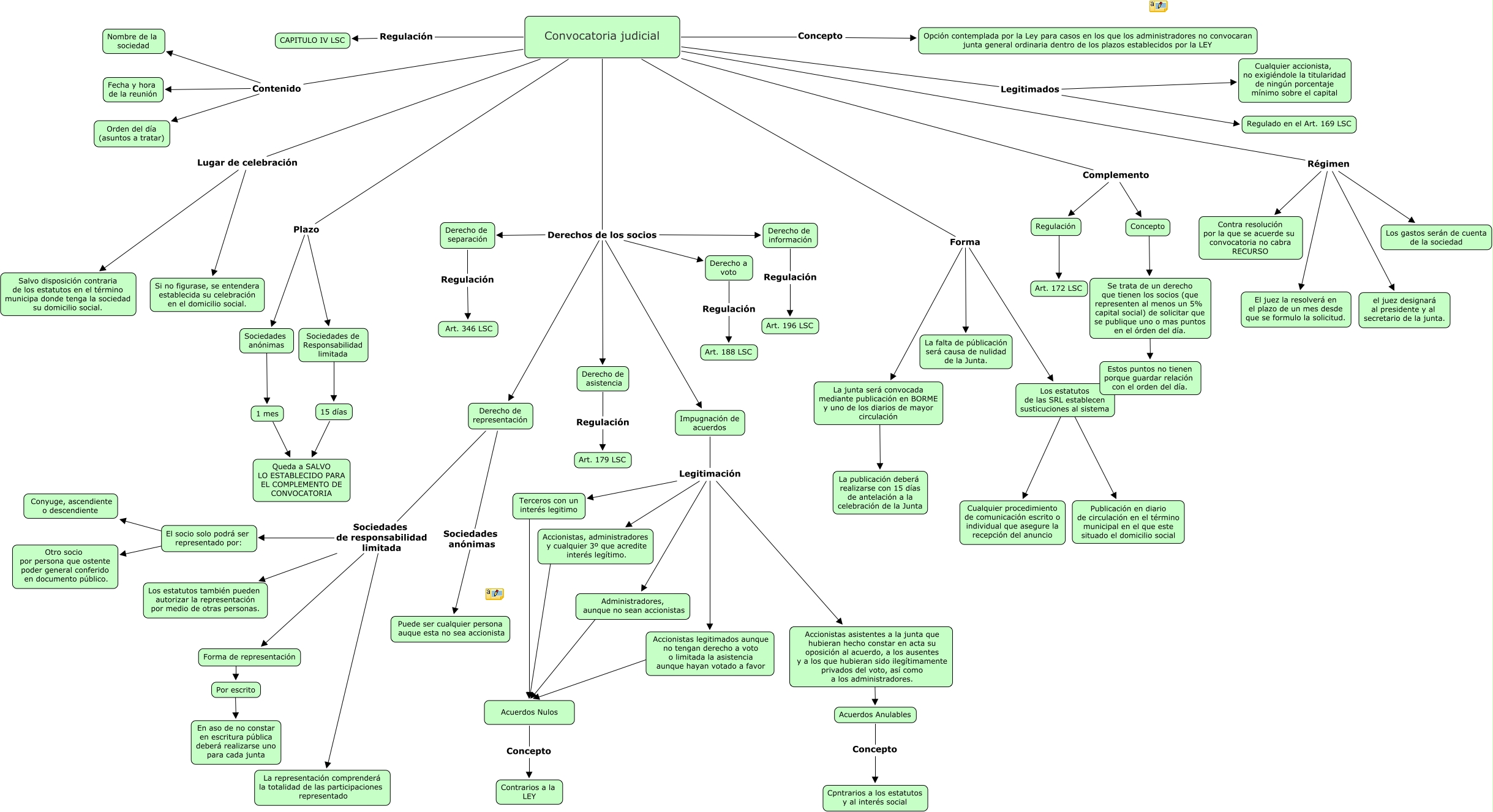Este Cmap, tiene información relacionada con: Mapa conceptual convocatoria judicial, Derecho de separación Regulación Art. 346 LSC, Por escrito ???? En aso de no constar en escritura pública deberá realizarse uno para cada junta, Convocatoria judicial Concepto Opción contemplada por la Ley para casos en los que los administradores no convocaran junta general ordinaria dentro de los plazos establecidos por la LEY, Derecho de asistencia Regulación Art. 179 LSC, Convocatoria judicial Contenido Orden del día (asuntos a tratar), Derecho de representación Sociedades anónimas Puede ser cualquier persona auque esta no sea accionista, Convocatoria judicial Regulación CAPITULO IV LSC, Convocatoria judicial Derechos de los socios Derecho de representación, Impugnación de acuerdos Legitimación Accionistas, administradores y cualquier 3º que acredite interés legítimo., Impugnación de acuerdos Legitimación Accionistas legitimados aunque no tengan derecho a voto o limitada la asistencia aunque hayan votado a favor, Convocatoria judicial Derechos de los socios Derecho a voto, Convocatoria judicial Régimen Contra resolución por la que se acuerde su convocatoria no cabra RECURSO, Acuerdos Anulables Concepto Cpntrarios a los estatutos y al interés social, Convocatoria judicial Derechos de los socios Derecho de información, Derecho de representación Sociedades de responsabilidad limitada Los estatutos también pueden autorizar la representación por medio de otras personas., Convocatoria judicial Régimen Los gastos serán de cuenta de la sociedad, Impugnación de acuerdos Legitimación Terceros con un interés legitimo, Convocatoria judicial Plazo Sociedades anónimas, Convocatoria judicial Contenido Fecha y hora de la reunión, Convocatoria judicial Derechos de los socios Derecho de separación