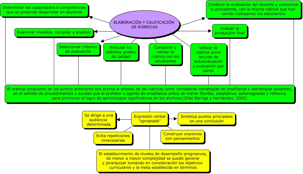 Este Cmap, tiene información relacionada con: elab, ELABORACIÓN Y CALIFICACIÓN DE RÚBRICAS ???? Utilizar la rúbrica como recurso de autoevaluación y evaluación por pares, ELABORACIÓN Y CALIFICACIÓN DE RÚBRICAS ???? Conducir la evaluación del docente y comunicar lo procedente, con la misma rúbrica que han venido trabajando los estudiantes, Evaluar la producción final ???? El manejo propuesto en los puntos anteriores nos acerca al empleo de las rúbricas como verdaderas estrategias de enseñanza o estrategias docentes, en el sentido de procedimientos y ayudas que el profesor o agente de enseñanza utiliza de maner flexible, adaptativa, autorregulada y reflexiva para promover el logro de aprendizajes significativos en los alumnos (Díaz Barriga y Hernández, 2002), ELABORACIÓN Y CALIFICACIÓN DE RÚBRICAS ???? Determinar las capacidades o competencias que se pretende desarrollar en alumnos, Expresión verbal "apropiada" ???? El establecimiento de niveles de desempeño progresivos, de menor a mayor complejidad se puede generar y jerarquizar tomando en consideración los objetivos curriculares y la meta establecida en términos, Compartir y validar la rúbrica con los estudiantes ???? El manejo propuesto en los puntos anteriores nos acerca al empleo de las rúbricas como verdaderas estrategias de enseñanza o estrategias docentes, en el sentido de procedimientos y ayudas que el profesor o agente de enseñanza utiliza de maner flexible, adaptativa, autorregulada y reflexiva para promover el logro de aprendizajes significativos en los alumnos (Díaz Barriga y Hernández, 2002), Examinar modelos, recopilar y analizar ???? El manejo propuesto en los puntos anteriores nos acerca al empleo de las rúbricas como verdaderas estrategias de enseñanza o estrategias docentes, en el sentido de procedimientos y ayudas que el profesor o agente de enseñanza utiliza de maner flexible, adaptativa, autorregulada y reflexiva para promover el logro de aprendizajes significativos en los alumnos (Díaz Barriga y Hernández, 2002), Conducir la evaluación del docente y comunicar lo procedente, con la misma rúbrica que han venido trabajando los estudiantes ???? El manejo propuesto en los puntos anteriores nos acerca al empleo de las rúbricas como verdaderas estrategias de enseñanza o estrategias docentes, en el sentido de procedimientos y ayudas que el profesor o agente de enseñanza utiliza de maner flexible, adaptativa, autorregulada y reflexiva para promover el logro de aprendizajes significativos en los alumnos (Díaz Barriga y Hernández, 2002), Seleccionar criterios de evaluación ???? El manejo propuesto en los puntos anteriores nos acerca al empleo de las rúbricas como verdaderas estrategias de enseñanza o estrategias docentes, en el sentido de procedimientos y ayudas que el profesor o agente de enseñanza utiliza de maner flexible, adaptativa, autorregulada y reflexiva para promover el logro de aprendizajes significativos en los alumnos (Díaz Barriga y Hernández, 2002), Expresión verbal "apropiada" ???? Sintetiza puntos principales en una conclusión, Utilizar la rúbrica como recurso de autoevaluación y evaluación por pares ???? El manejo propuesto en los puntos anteriores nos acerca al empleo de las rúbricas como verdaderas estrategias de enseñanza o estrategias docentes, en el sentido de procedimientos y ayudas que el profesor o agente de enseñanza utiliza de maner flexible, adaptativa, autorregulada y reflexiva para promover el logro de aprendizajes significativos en los alumnos (Díaz Barriga y Hernández, 2002), ELABORACIÓN Y CALIFICACIÓN DE RÚBRICAS E Examinar modelos, recopilar y analizar, Expresión verbal "apropiada" ???? Construye oraciones con pensamientos, Expresión verbal "apropiada" ???? Se dirige a una audiencia determinada, ELABORACIÓN Y CALIFICACIÓN DE RÚBRICAS ???? Seleccionar criterios de evaluación, Articular los distintos grados de calidad ???? El manejo propuesto en los puntos anteriores nos acerca al empleo de las rúbricas como verdaderas estrategias de enseñanza o estrategias docentes, en el sentido de procedimientos y ayudas que el profesor o agente de enseñanza utiliza de maner flexible, adaptativa, autorregulada y reflexiva para promover el logro de aprendizajes significativos en los alumnos (Díaz Barriga y Hernández, 2002), ELABORACIÓN Y CALIFICACIÓN DE RÚBRICAS ???? Articular los distintos grados de calidad, Expresión verbal "apropiada" ???? Evita repeticiones innecesarias, El manejo propuesto en los puntos anteriores nos acerca al empleo de las rúbricas como verdaderas estrategias de enseñanza o estrategias docentes, en el sentido de procedimientos y ayudas que el profesor o agente de enseñanza utiliza de maner flexible, adaptativa, autorregulada y reflexiva para promover el logro de aprendizajes significativos en los alumnos (Díaz Barriga y Hernández, 2002) ???? Expresión verbal "apropiada", Determinar las capacidades o competencias que se pretende desarrollar en alumnos ???? El manejo propuesto en los puntos anteriores nos acerca al empleo de las rúbricas como verdaderas estrategias de enseñanza o estrategias docentes, en el sentido de procedimientos y ayudas que el profesor o agente de enseñanza utiliza de maner flexible, adaptativa, autorregulada y reflexiva para promover el logro de aprendizajes significativos en los alumnos (Díaz Barriga y Hernández, 2002)