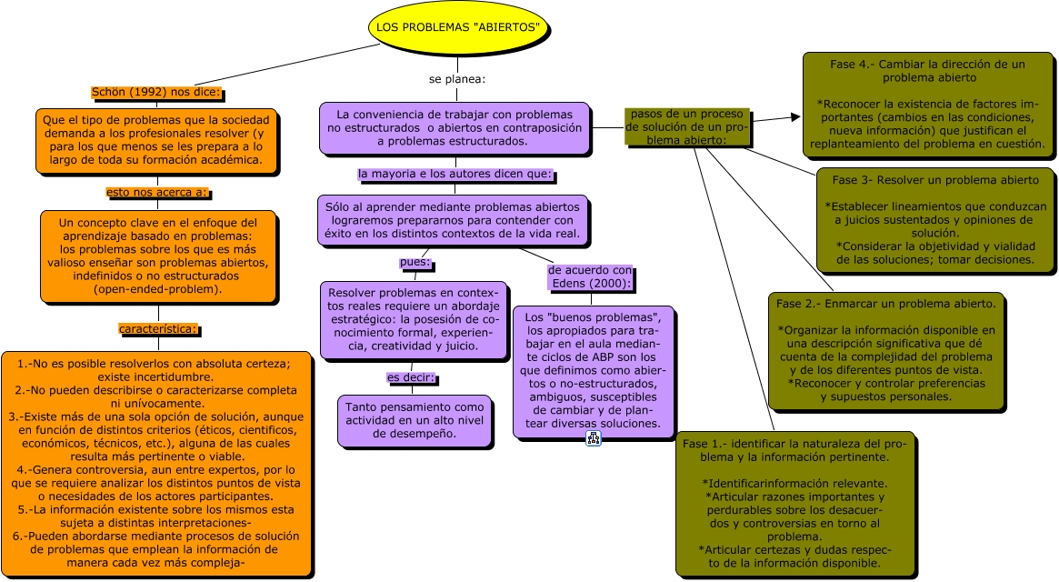 Este Cmap, tiene información relacionada con: proab, Que el tipo de problemas que la sociedad demanda a los profesionales resolver (y para los que menos se les prepara a lo largo de toda su formación académica. esto nos acerca a: Un concepto clave en el enfoque del aprendizaje basado en problemas: los problemas sobre los que es más valioso enseñar son problemas abiertos, indefinidos o no estructurados (open-ended-problem)., La conveniencia de trabajar con problemas no estructurados o abiertos en contraposición a problemas estructurados. pasos de un proceso de solución de un pro- blema abierto: Fase 3- Resolver un problema abierto *Establecer lineamientos que conduzcan a juicios sustentados y opiniones de solución. *Considerar la objetividad y vialidad de las soluciones; tomar decisiones., La conveniencia de trabajar con problemas no estructurados o abiertos en contraposición a problemas estructurados. la mayoria e los autores dicen que: Sólo al aprender mediante problemas abiertos lograremos prepararnos para contender con éxito en los distintos contextos de la vida real., Resolver problemas en contex- tos reales requiere un abordaje estratégico: la posesión de co- nocimiento formal, experien- cia, creatividad y juicio. es decir: Tanto pensamiento como actividad en un alto nivel de desempeño., LOS PROBLEMAS "ABIERTOS" Schön (1992) nos dice: Que el tipo de problemas que la sociedad demanda a los profesionales resolver (y para los que menos se les prepara a lo largo de toda su formación académica., La conveniencia de trabajar con problemas no estructurados o abiertos en contraposición a problemas estructurados. pasos de un proceso de solución de un pro- blema abierto: Fase 2.- Enmarcar un problema abierto. *Organizar la información disponible en una descripción significativa que dé cuenta de la complejidad del problema y de los diferentes puntos de vista. *Reconocer y controlar preferencias y supuestos personales., Un concepto clave en el enfoque del aprendizaje basado en problemas: los problemas sobre los que es más valioso enseñar son problemas abiertos, indefinidos o no estructurados (open-ended-problem). característica: 1.-No es posible resolverlos con absoluta certeza; existe incertidumbre. 2.-No pueden describirse o caracterizarse completa ni unívocamente. 3.-Existe más de una sola opción de solución, aunque en función de distintos criterios (éticos, cientificos, económicos, técnicos, etc.), alguna de las cuales resulta más pertinente o viable. 4.-Genera controversia, aun entre expertos, por lo que se requiere analizar los distintos puntos de vista o necesidades de los actores participantes. 5.-La información existente sobre los mismos esta sujeta a distintas interpretaciones- 6.-Pueden abordarse mediante procesos de solución de problemas que emplean la información de manera cada vez más compleja-, La conveniencia de trabajar con problemas no estructurados o abiertos en contraposición a problemas estructurados. pasos de un proceso de solución de un pro- blema abierto: Fase 4.- Cambiar la dirección de un problema abierto *Reconocer la existencia de factores im- portantes (cambios en las condiciones, nueva información) que justifican el replanteamiento del problema en cuestión., Sólo al aprender mediante problemas abiertos lograremos prepararnos para contender con éxito en los distintos contextos de la vida real. de acuerdo con Edens (2000): Los "buenos problemas", los apropiados para tra- bajar en el aula median- te ciclos de ABP son los que definimos como abier- tos o no-estructurados, ambiguos, susceptibles de cambiar y de plan- tear diversas soluciones., La conveniencia de trabajar con problemas no estructurados o abiertos en contraposición a problemas estructurados. pasos de un proceso de solución de un pro- blema abierto: Fase 1.- identificar la naturaleza del pro- blema y la información pertinente. *Identificarinformación relevante. *Articular razones importantes y perdurables sobre los desacuer- dos y controversias en torno al problema. *Articular certezas y dudas respec- to de la información disponible., Sólo al aprender mediante problemas abiertos lograremos prepararnos para contender con éxito en los distintos contextos de la vida real. pues: Resolver problemas en contex- tos reales requiere un abordaje estratégico: la posesión de co- nocimiento formal, experien- cia, creatividad y juicio., LOS PROBLEMAS "ABIERTOS" se planea: La conveniencia de trabajar con problemas no estructurados o abiertos en contraposición a problemas estructurados.