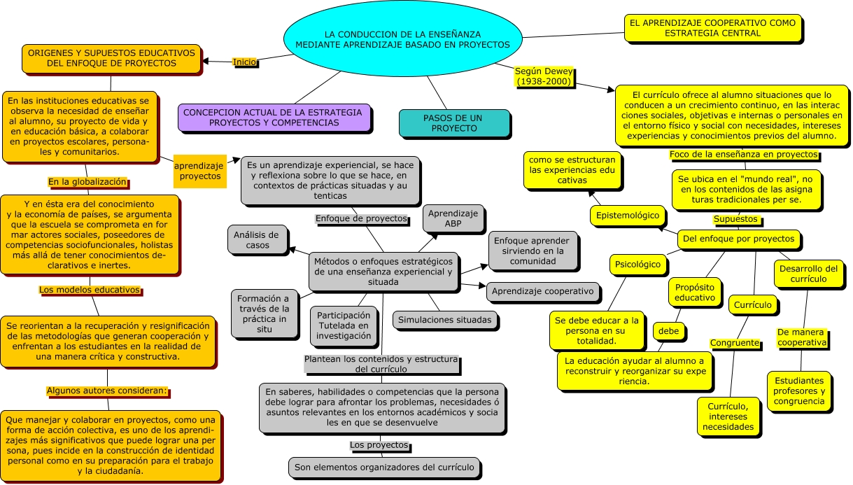 Este Cmap, tiene información relacionada con: proyecap2, Métodos o enfoques estratégicos de una enseñanza experiencial y situada ???? Simulaciones situadas, Del enfoque por proyectos ???? Currículo, En las instituciones educativas se observa la necesidad de enseñar al alumno, su proyecto de vida y en educación básica, a colaborar en proyectos escolares, persona- les y comunitarios. En la globalización Y en ésta era del conocimiento y la economía de países, se argumenta que la escuela se comprometa en for mar actores sociales, poseedores de competencias sociofuncionales, holistas más allá de tener conocimientos de- clarativos e inertes., Métodos o enfoques estratégicos de una enseñanza experiencial y situada ???? Enfoque aprender sirviendo en la comunidad, En las instituciones educativas se observa la necesidad de enseñar al alumno, su proyecto de vida y en educación básica, a colaborar en proyectos escolares, persona- les y comunitarios. aprendizaje proyectos Es un aprendizaje experiencial, se hace y reflexiona sobre lo que se hace, en contextos de prácticas situadas y au tenticas, Epistemológico ???? como se estructuran las experiencias edu cativas, Y en ésta era del conocimiento y la economía de países, se argumenta que la escuela se comprometa en for mar actores sociales, poseedores de competencias sociofuncionales, holistas más allá de tener conocimientos de- clarativos e inertes. Los modelos educativos Se reorientan a la recuperación y resignificación de las metodologías que generan cooperación y enfrentan a los estudiantes en la realidad de una manera crítica y constructiva., Del enfoque por proyectos ???? Epistemológico, Métodos o enfoques estratégicos de una enseñanza experiencial y situada ???? Análisis de casos, Propósito educativo ???? debe, LA CONDUCCION DE LA ENSEÑANZA MEDIANTE APRENDIZAJE BASADO EN PROYECTOS Según Dewey (1938-2000) El currículo ofrece al alumno situaciones que lo conducen a un crecimiento continuo, en las interac ciones sociales, objetivas e internas o personales en el entorno físico y social con necesidades, intereses experiencias y conocimientos previos del alumno., Métodos o enfoques estratégicos de una enseñanza experiencial y situada ???? Aprendizaje cooperativo, Métodos o enfoques estratégicos de una enseñanza experiencial y situada Plantean los contenidos y estructura del currículo En saberes, habilidades o competencias que la persona debe lograr para afrontar los problemas, necesidades ó asuntos relevantes en los entornos académicos y socia les en que se desenvuelve, debe ???? La educación ayudar al alumno a reconstruir y reorganizar su expe riencia., PASOS DE UN PROYECTO ???? LA CONDUCCION DE LA ENSEÑANZA MEDIANTE APRENDIZAJE BASADO EN PROYECTOS, Del enfoque por proyectos ???? Psicológico, Del enfoque por proyectos ???? Desarrollo del currículo, Es un aprendizaje experiencial, se hace y reflexiona sobre lo que se hace, en contextos de prácticas situadas y au tenticas Enfoque de proyectos Métodos o enfoques estratégicos de una enseñanza experiencial y situada, EL APRENDIZAJE COOPERATIVO COMO ESTRATEGIA CENTRAL ???? LA CONDUCCION DE LA ENSEÑANZA MEDIANTE APRENDIZAJE BASADO EN PROYECTOS, CONCEPCION ACTUAL DE LA ESTRATEGIA PROYECTOS Y COMPETENCIAS ???? LA CONDUCCION DE LA ENSEÑANZA MEDIANTE APRENDIZAJE BASADO EN PROYECTOS