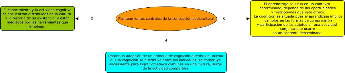Este Cmap, tiene información relacionada con: metf2, Planteamientos centrales de la concepción sociocultural 5 El aprendizaje se situa en un contexto determinado, depende de las oportunidades y restricciones que éste ofrece. La cognición es situada pues el aprendizaje implica cambios en las formas de comprensión y participación de los sujetos en una actividad conjunta que ocurre en un contexto determinado., Planteamientos centrales de la concepción sociocultural 4 Implica la adopción de un enfoque de cognición distribuida, afirma que la cognición se distribuye entre los individuos, se construye socialmente para lograr objetivos comunes en una cultura, surge de la actividad compartida., Planteamientos centrales de la concepción sociocultural 3 El conocimiento y la actividad cognitiva se encuentran distribuidos en la cultura y la historia de su existencia, y están mediados por las herramientas que emplean.