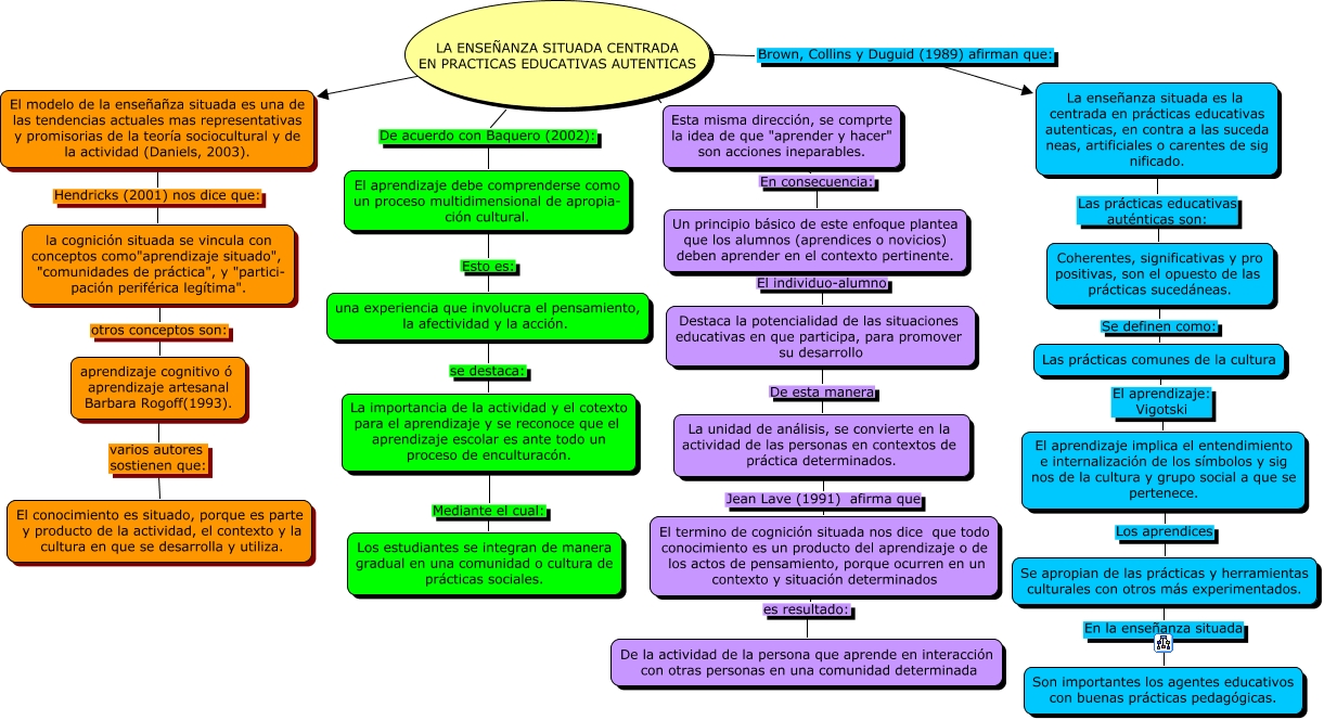 Este Cmap, tiene información relacionada con: ensesit, La importancia de la actividad y el cotexto para el aprendizaje y se reconoce que el aprendizaje escolar es ante todo un proceso de enculturacón. Mediante el cual: Los estudiantes se integran de manera gradual en una comunidad o cultura de prácticas sociales., aprendizaje cognitivo ó aprendizaje artesanal Barbara Rogoff(1993). varios autores sostienen que: El conocimiento es situado, porque es parte y producto de la actividad, el contexto y la cultura en que se desarrolla y utiliza., Un principio básico de este enfoque plantea que los alumnos (aprendices o novicios) deben aprender en el contexto pertinente. El individuo-alumno Destaca la potencialidad de las situaciones educativas en que participa, para promover su desarrollo, Las prácticas comunes de la cultura El aprendizaje: Vigotski El aprendizaje implica el entendimiento e internalización de los símbolos y sig nos de la cultura y grupo social a que se pertenece., Esta misma dirección, se comprte la idea de que "aprender y hacer" son acciones ineparables. En consecuencia: Un principio básico de este enfoque plantea que los alumnos (aprendices o novicios) deben aprender en el contexto pertinente., La unidad de análisis, se convierte en la actividad de las personas en contextos de práctica determinados. Jean Lave (1991) afirma que El termino de cognición situada nos dice que todo conocimiento es un producto del aprendizaje o de los actos de pensamiento, porque ocurren en un contexto y situación determinados, La enseñanza situada es la centrada en prácticas educativas autenticas, en contra a las suceda neas, artificiales o carentes de sig nificado. Las prácticas educativas auténticas son: Coherentes, significativas y pro positivas, son el opuesto de las prácticas sucedáneas., una experiencia que involucra el pensamiento, la afectividad y la acción. se destaca: La importancia de la actividad y el cotexto para el aprendizaje y se reconoce que el aprendizaje escolar es ante todo un proceso de enculturacón., El aprendizaje implica el entendimiento e internalización de los símbolos y sig nos de la cultura y grupo social a que se pertenece. Los aprendices Se apropian de las prácticas y herramientas culturales con otros más experimentados., Se apropian de las prácticas y herramientas culturales con otros más experimentados. En la enseñanza situada Son importantes los agentes educativos con buenas prácticas pedagógicas., Coherentes, significativas y pro positivas, son el opuesto de las prácticas sucedáneas. Se definen como: Las prácticas comunes de la cultura, la cognición situada se vincula con conceptos como"aprendizaje situado", "comunidades de práctica", y "partici- pación periférica legítima". otros conceptos son: aprendizaje cognitivo ó aprendizaje artesanal Barbara Rogoff(1993)., El aprendizaje debe comprenderse como un proceso multidimensional de apropia- ción cultural. Esto es: una experiencia que involucra el pensamiento, la afectividad y la acción., El termino de cognición situada nos dice que todo conocimiento es un producto del aprendizaje o de los actos de pensamiento, porque ocurren en un contexto y situación determinados es resultado: De la actividad de la persona que aprende en interacción con otras personas en una comunidad determinada, LA ENSEÑANZA SITUADA CENTRADA EN PRACTICAS EDUCATIVAS AUTENTICAS ???? El modelo de la enseñañza situada es una de las tendencias actuales mas representativas y promisorias de la teoría sociocultural y de la actividad (Daniels, 2003)., El modelo de la enseñañza situada es una de las tendencias actuales mas representativas y promisorias de la teoría sociocultural y de la actividad (Daniels, 2003). Hendricks (2001) nos dice que: la cognición situada se vincula con conceptos como"aprendizaje situado", "comunidades de práctica", y "partici- pación periférica legítima"., LA ENSEÑANZA SITUADA CENTRADA EN PRACTICAS EDUCATIVAS AUTENTICAS ???? Esta misma dirección, se comprte la idea de que "aprender y hacer" son acciones ineparables., Destaca la potencialidad de las situaciones educativas en que participa, para promover su desarrollo De esta manera La unidad de análisis, se convierte en la actividad de las personas en contextos de práctica determinados., LA ENSEÑANZA SITUADA CENTRADA EN PRACTICAS EDUCATIVAS AUTENTICAS Brown, Collins y Duguid (1989) afirman que: La enseñanza situada es la centrada en prácticas educativas autenticas, en contra a las suceda neas, artificiales o carentes de sig nificado., LA ENSEÑANZA SITUADA CENTRADA EN PRACTICAS EDUCATIVAS AUTENTICAS De acuerdo con Baquero (2002): El aprendizaje debe comprenderse como un proceso multidimensional de apropia- ción cultural.