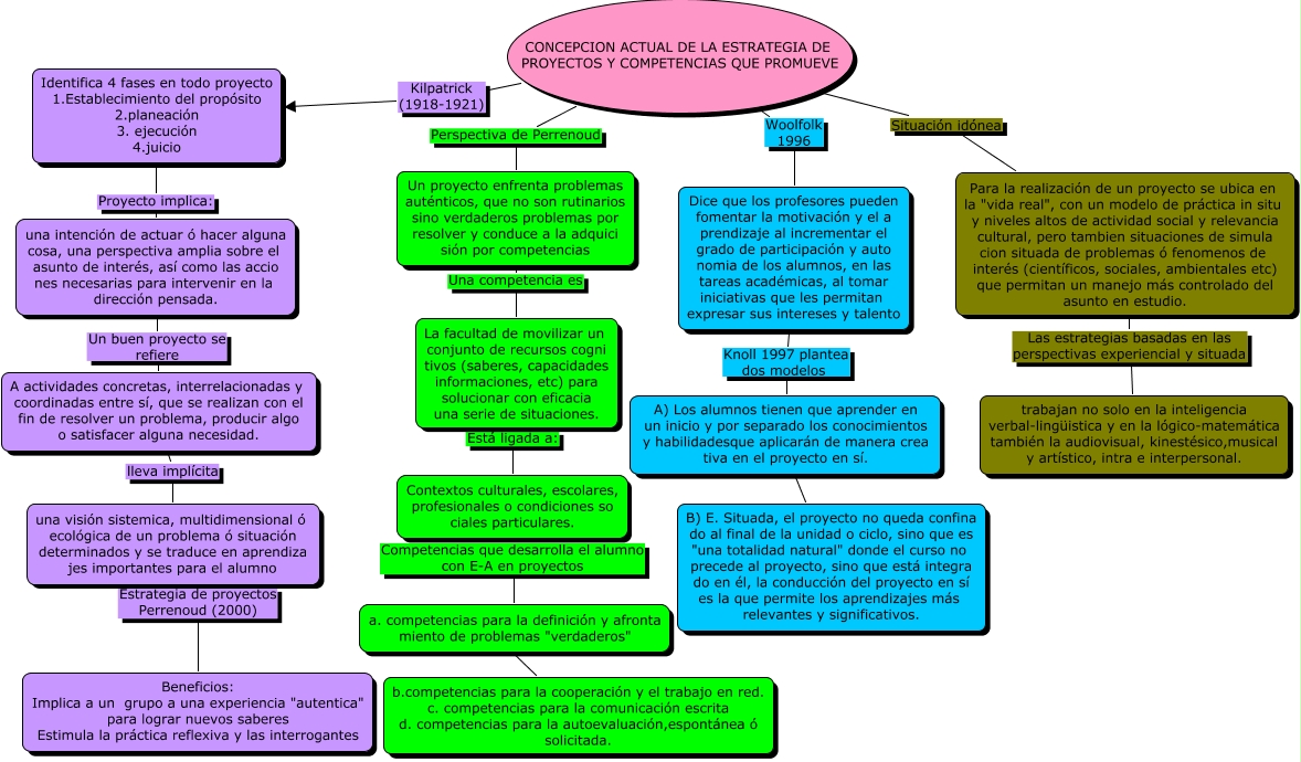 Este Cmap, tiene información relacionada con: concepact, Dice que los profesores pueden fomentar la motivación y el a prendizaje al incrementar el grado de participación y auto nomia de los alumnos, en las tareas académicas, al tomar iniciativas que les permitan expresar sus intereses y talento Knoll 1997 plantea dos modelos A) Los alumnos tienen que aprender en un inicio y por separado los conocimientos y habilidadesque aplicarán de manera crea tiva en el proyecto en sí., a. competencias para la definición y afronta miento de problemas "verdaderos" ???? b.competencias para la cooperación y el trabajo en red. c. competencias para la comunicación escrita d. competencias para la autoevaluación,espontánea ó solicitada., A) Los alumnos tienen que aprender en un inicio y por separado los conocimientos y habilidadesque aplicarán de manera crea tiva en el proyecto en sí. ???? B) E. Situada, el proyecto no queda confina do al final de la unidad o ciclo, sino que es "una totalidad natural" donde el curso no precede al proyecto, sino que está integra do en él, la conducción del proyecto en sí es la que permite los aprendizajes más relevantes y significativos., La facultad de movilizar un conjunto de recursos cogni tivos (saberes, capacidades informaciones, etc) para solucionar con eficacia una serie de situaciones. Está ligada a: Contextos culturales, escolares, profesionales o condiciones so ciales particulares., Contextos culturales, escolares, profesionales o condiciones so ciales particulares. Competencias que desarrolla el alumno con E-A en proyectos a. competencias para la definición y afronta miento de problemas "verdaderos", A actividades concretas, interrelacionadas y coordinadas entre sí, que se realizan con el fin de resolver un problema, producir algo o satisfacer alguna necesidad. lleva implícita una visión sistemica, multidimensional ó ecológica de un problema ó situación determinados y se traduce en aprendiza jes importantes para el alumno, una visión sistemica, multidimensional ó ecológica de un problema ó situación determinados y se traduce en aprendiza jes importantes para el alumno Estrategia de proyectos Perrenoud (2000) Beneficios: Implica a un grupo a una experiencia "autentica" para lograr nuevos saberes Estimula la práctica reflexiva y las interrogantes, Un proyecto enfrenta problemas auténticos, que no son rutinarios sino verdaderos problemas por resolver y conduce a la adquici sión por competencias Una competencia es La facultad de movilizar un conjunto de recursos cogni tivos (saberes, capacidades informaciones, etc) para solucionar con eficacia una serie de situaciones., CONCEPCION ACTUAL DE LA ESTRATEGIA DE PROYECTOS Y COMPETENCIAS QUE PROMUEVE Kilpatrick (1918-1921) Identifica 4 fases en todo proyecto 1.Establecimiento del propósito 2.planeación 3. ejecución 4.juicio, CONCEPCION ACTUAL DE LA ESTRATEGIA DE PROYECTOS Y COMPETENCIAS QUE PROMUEVE Woolfolk 1996 Dice que los profesores pueden fomentar la motivación y el a prendizaje al incrementar el grado de participación y auto nomia de los alumnos, en las tareas académicas, al tomar iniciativas que les permitan expresar sus intereses y talento, una intención de actuar ó hacer alguna cosa, una perspectiva amplia sobre el asunto de interés, así como las accio nes necesarias para intervenir en la dirección pensada. Un buen proyecto se refiere A actividades concretas, interrelacionadas y coordinadas entre sí, que se realizan con el fin de resolver un problema, producir algo o satisfacer alguna necesidad., CONCEPCION ACTUAL DE LA ESTRATEGIA DE PROYECTOS Y COMPETENCIAS QUE PROMUEVE Perspectiva de Perrenoud Un proyecto enfrenta problemas auténticos, que no son rutinarios sino verdaderos problemas por resolver y conduce a la adquici sión por competencias, CONCEPCION ACTUAL DE LA ESTRATEGIA DE PROYECTOS Y COMPETENCIAS QUE PROMUEVE Situación idónea Para la realización de un proyecto se ubica en la "vida real", con un modelo de práctica in situ y niveles altos de actividad social y relevancia cultural, pero tambien situaciones de simula cion situada de problemas ó fenomenos de interés (científicos, sociales, ambientales etc) que permitan un manejo más controlado del asunto en estudio., Identifica 4 fases en todo proyecto 1.Establecimiento del propósito 2.planeación 3. ejecución 4.juicio Proyecto implica: una intención de actuar ó hacer alguna cosa, una perspectiva amplia sobre el asunto de interés, así como las accio nes necesarias para intervenir en la dirección pensada., Para la realización de un proyecto se ubica en la "vida real", con un modelo de práctica in situ y niveles altos de actividad social y relevancia cultural, pero tambien situaciones de simula cion situada de problemas ó fenomenos de interés (científicos, sociales, ambientales etc) que permitan un manejo más controlado del asunto en estudio. Las estrategias basadas en las perspectivas experiencial y situada trabajan no solo en la inteligencia verbal-lingüistica y en la lógico-matemática también la audiovisual, kinestésico,musical y artístico, intra e interpersonal.