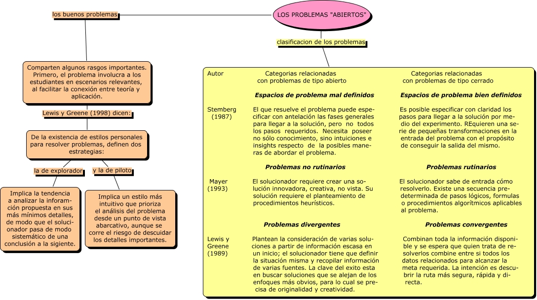 Este Cmap, tiene información relacionada con: proab2, LOS PROBLEMAS "ABIERTOS" los buenos problemas Comparten algunos rasgos importantes. Primero, el problema involucra a los estudiantes en escenarios relevantes, al facilitar la conexión entre teoría y aplicación., Comparten algunos rasgos importantes. Primero, el problema involucra a los estudiantes en escenarios relevantes, al facilitar la conexión entre teoría y aplicación. Lewis y Greene (1998) dicen: De la existencia de estilos personales para resolver problemas, definen dos estrategias:, De la existencia de estilos personales para resolver problemas, definen dos estrategias: la de explorador Implica la tendencia a analizar la inforam- ción propuesta en sus más mínimos detalles, de modo que el soluci- onador pasa de modo sistemático de una conclusión a la sigiente., LOS PROBLEMAS "ABIERTOS" clasificacion de los problemas Autor Categorias relacionadas Categorias relacionadas con problemas de tipo abierto con problemas de tipo cerrado Espacios de problema mal definidos Espacios de problema bien definidos Stemberg El que resuelve el problema puede espe- Es posible especificar con claridad los (1987) cificar con antelación las fases generales pasos para llegar a la solución por me- para llegar a la solución, pero no todos dio del experimento. REquieren una se- los pasos requeridos. Necesita poseer rie de pequeñas transformaciones en la no sólo conocimiento, sino intuiciones e entrada del problema con el propósito insights respecto de la posibles mane- de conseguir la salida del mismo. ras de abordar el problema. Problemas no rutinarios Problemas rutinarios Mayer El solucionador requiere crear una so- El solucionador sabe de entrada cómo (1993) lución innovadora, creativa, no vista. Su resolverlo. Existe una secuencia pre- solución requiere el planteamiento de determinada de pasos lógicos, formulas procedimientos heurísticos. o procedimientos algorítmicos aplicables al problema. Problemas divergentes Problemas convergentes Lewis y Plantean la consideración de varias solu- Combinan toda la información disponi- Greene ciones a partir de información escasa en ble y se espera que quien trata de re- (1989) un inicio; el solucionador tiene que definir solverlos combine entre si todos los la situación misma y recopilar información datos relacionados para alcanzar la de varias fuentes. La clave del exito esta meta requerida. La intención es descu- en buscar soluciones que se alejan de los brir la ruta más segura, rápida y di- enfoques más obvios, para lo cual se pre- recta. cisa de originalidad y creatividad., De la existencia de estilos personales para resolver problemas, definen dos estrategias: y la de piloto Implica un estilo más intuitivo que prioriza el análisis del problema desde un punto de vista abarcativo, aunque se corre el riesgo de descuidar los detalles importantes.