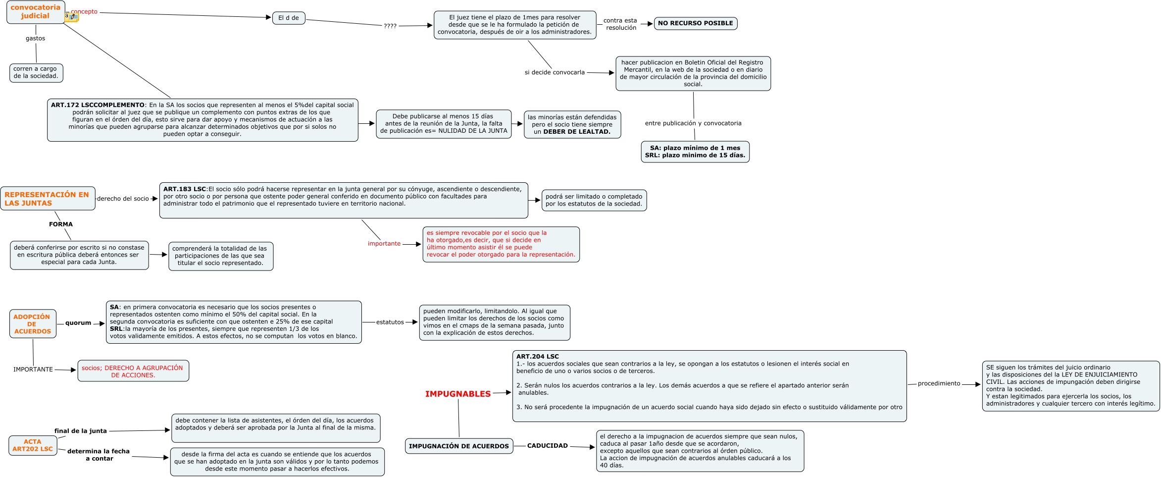 Este Cmap, tiene información relacionada con: CONVOCATORIA JUDICIAL, ACTA ART202 LSC final de la junta debe contener la lista de asistentes, el órden del día, los acuerdos adoptados y deberá ser aprobada por la Junta al final de la misma., IMPUGNACIÓN DE ACUERDOS IMPUGNABLES ART.204 LSC 1.- los acuerdos sociales que sean contrarios a la ley, se opongan a los estatutos o lesionen el interés social en beneficio de uno o varios socios o de terceros. 2. Serán nulos los acuerdos contrarios a la ley. Los demás acuerdos a que se refiere el apartado anterior serán anulables. 3. No será procedente la impugnación de un acuerdo social cuando haya sido dejado sin efecto o sustituido válidamente por otro, ACTA ART202 LSC determina la fecha a contar desde la firma del acta es cuando se entiende que los acuerdos que se han adoptado en la junta son válidos y por lo tanto podemos desde este momento pasar a hacerlos efectivos., ART.183 LSC:El socio sólo podrá hacerse representar en la junta general por su cónyuge, ascendiente o descendiente, por otro socio o por persona que ostente poder general conferido en documento público con facultades para administrar todo el patrimonio que el representado tuviere en territorio nacional. ???? podrá ser limitado o completado por los estatutos de la sociedad., REPRESENTACIÓN EN LAS JUNTAS FORMA deberá conferirse por escrito si no constase en escritura pública deberá entonces ser especial para cada Junta., Debe publicarse al menos 15 días antes de la reunión de la Junta, la falta de publicación es= NULIDAD DE LA JUNTA ???? las minorías están defendidas pero el socio tiene siempre un DEBER DE LEALTAD., ART.204 LSC 1.- los acuerdos sociales que sean contrarios a la ley, se opongan a los estatutos o lesionen el interés social en beneficio de uno o varios socios o de terceros. 2. Serán nulos los acuerdos contrarios a la ley. Los demás acuerdos a que se refiere el apartado anterior serán anulables. 3. No será procedente la impugnación de un acuerdo social cuando haya sido dejado sin efecto o sustituido válidamente por otro procedimiento SE siguen los trámites del juicio ordinario y las disposiciones del la LEY DE ENJUICIAMIENTO CIVIL. Las acciones de impungación deben dirigirse contra la sociedad. Y estan legitimados para ejercerla los socios, los administradores y cualquier tercero con interés legítimo., IMPUGNACIÓN DE ACUERDOS CADUCIDAD el derecho a la impugnacion de acuerdos siempre que sean nulos, caduca al pasar 1año desde que se acordaron, excepto aquellos que sean contrarios al órden público. La accion de impugnación de acuerdos anulables caducará a los 40 días., convocatoria judicial gastos corren a cargo de la sociedad., hacer publicacion en Boletin Oficial del Registro Mercantil, en la web de la sociedad o en diario de mayor circulación de la provincia del domicilio social. entre publicación y convocatoria SA: plazo mínimo de 1 mes SRL: plazo minimo de 15 días., El juez tiene el plazo de 1mes para resolver desde que se le ha formulado la petición de convocatoria, después de oir a los administradores. contra esta resolución NO RECURSO POSIBLE, ADOPCIÓN DE ACUERDOS quorum SA: en primera convocatoria es necesario que los socios presentes o representados ostenten como mínimo el 50% del capital social. En la segunda convocatoria es suficiente con que ostenten e 25% de ese capital SRL:la mayoría de los presentes, siempre que representen 1/3 de los votos validamente emitidos. A estos efectos, no se computan los votos en blanco., ADOPCIÓN DE ACUERDOS IMPORTANTE socios; DERECHO A AGRUPACIÓN DE ACCIONES., deberá conferirse por escrito si no constase en escritura pública deberá entonces ser especial para cada Junta. ???? comprenderá la totalidad de las participaciones de las que sea titular el socio representado., El juez tiene el plazo de 1mes para resolver desde que se le ha formulado la petición de convocatoria, después de oir a los administradores. si decide convocarla hacer publicacion en Boletin Oficial del Registro Mercantil, en la web de la sociedad o en diario de mayor circulación de la provincia del domicilio social., SA: en primera convocatoria es necesario que los socios presentes o representados ostenten como mínimo el 50% del capital social. En la segunda convocatoria es suficiente con que ostenten e 25% de ese capital SRL:la mayoría de los presentes, siempre que representen 1/3 de los votos validamente emitidos. A estos efectos, no se computan los votos en blanco. estatutos pueden modificarlo, limitandolo. Al igual que pueden limitar los derechos de los socios como vimos en el cmaps de la semana pasada, junto con la explicación de estos derechos., convocatoria judicial ???? ART.172 LSCCOMPLEMENTO: En la SA los socios que representen al menos el 5%del capital social podrán solicitar al juez que se publique un complemento con puntos extras de los que figuran en el órden del día, esto sirve para dar apoyo y mecanismos de actuación a las minorías que pueden agruparse para alcanzar determinados objetivos que por si solos no pueden optar a conseguir., ART.172 LSCCOMPLEMENTO: En la SA los socios que representen al menos el 5%del capital social podrán solicitar al juez que se publique un complemento con puntos extras de los que figuran en el órden del día, esto sirve para dar apoyo y mecanismos de actuación a las minorías que pueden agruparse para alcanzar determinados objetivos que por si solos no pueden optar a conseguir. ???? Debe publicarse al menos 15 días antes de la reunión de la Junta, la falta de publicación es= NULIDAD DE LA JUNTA, ART.183 LSC:El socio sólo podrá hacerse representar en la junta general por su cónyuge, ascendiente o descendiente, por otro socio o por persona que ostente poder general conferido en documento público con facultades para administrar todo el patrimonio que el representado tuviere en territorio nacional. importante es siempre revocable por el socio 