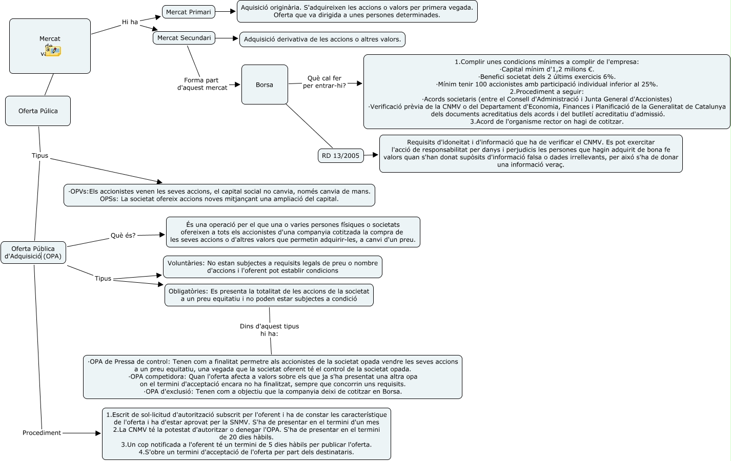 Este Cmap, tiene información relacionada con: escenari 9, Mercat Secundari Forma part d'aquest mercat Borsa, Oferta Pública d'Adquisició (OPA) Què és? És una operació per el que una o varies persones físiques o societats ofereixen a tots els accionistes d'una companyia cotitzada la compra de les seves accions o d'altres valors que permetin adquirir-les, a canvi d'un preu., Borsa Què cal fer per entrar-hi? 1.Complir unes condicions mínimes a complir de l'empresa: ·Capital mínim d'1,2 milions €. ·Benefici societat dels 2 últims exercicis 6%. ·Mínim tenir 100 accionistes amb participació individual inferior al 25%. 2.Procediment a seguir: ·Acords societaris (entre el Consell d'Administració i Junta General d'Accionistes) ·Verificació prèvia de la CNMV o del Departament d'Economia, Finances i Planificació de la Generalitat de Catalunya dels documents acreditatius dels acords i del butlletí acreditatiu d'admissió. 3.Acord de l'organisme rector on hagi de cotitzar., Oferta Pública d'Adquisició (OPA) Tipus Obligatòries: Es presenta la totalitat de les accions de la societat a un preu equitatiu i no poden estar subjectes a condició, Mercat Primari ???? Aquisició originària. S'adquireixen les accions o valors per primera vegada. Oferta que va dirigida a unes persones determinades., Oferta Pública d'Adquisició (OPA) Procediment 1.Escrit de sol·licitud d'autorització subscrit per l'oferent i ha de constar les característique de l'oferta i ha d'estar aprovat per la SNMV. S'ha de presentar en el termini d'un mes 2.La CNMV té la potestat d'autoritzar o denegar l'OPA. S'ha de presentar en el termini de 20 dies hàbils. 3.Un cop notificada a l'oferent té un termini de 5 dies hàbils per publicar l'oferta. 4.S'obre un termini d'acceptació de l'oferta per part dels destinataris., Borsa ???? RD 13/2005, Oferta Púlica Tipus ·OPVs:Els accionistes venen les seves accions, el capital social no canvia, només canvia de mans. OPSs: La societat ofereix accions noves mitjançant una ampliació del capital., Mercat de valors Hi ha Mercat Primari, Mercat Secundari ???? Adquisició derivativa de les accions o altres valors., Oferta Pública d'Adquisició (OPA) Tipus ·OPVs:Els accionistes venen les seves accions, el capital social no canvia, només canvia de mans. OPSs: La societat ofereix accions noves mitjançant una ampliació del capital., Obligatòries: Es presenta la totalitat de les accions de la societat a un preu equitatiu i no poden estar subjectes a condició Dins d'aquest tipus hi ha: ·OPA de Pressa de control: Tenen com a finalitat permetre als accionistes de la societat opada vendre les seves accions a un preu equitatiu, una vegada que la societat oferent té el control de la societat opada. ·OPA competidora: Quan l'oferta afecta a valors sobre els que ja s'ha presentat una altra opa on el termini d'acceptació encara no ha finalitzat, sempre que concorrin uns requisits. ·OPA d'exclusió: Tenen com a objectiu que la companyia deixi de cotitzar en Borsa., Mercat de valors Hi ha Mercat Secundari, Oferta Pública d'Adquisició (OPA) Tipus Voluntàries: No estan subjectes a requisits legals de preu o nombre d'accions i l'oferent pot establir condicions, RD 13/2005 ???? Requisits d'idoneitat i d'informació que ha de verificar el CNMV. Es pot exercitar l'acció de responsabilitat per danys i perjudicis les persones que hagin adquirit de bona fe valors quan s'han donat supòsits d'informació falsa o dades irrellevants, per aixó s'ha de donar una informació veraç., Mercat de valors ???? Oferta Púlica