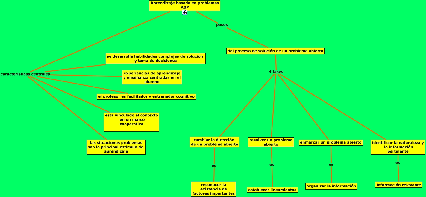 Este Cmap, tiene información relacionada con: 9. capitulo 3.1, Aprendizaje basado en problemas ABP caracteristicas centrales el profesor es facilitador y entrenador cognitivo, del proceso de solución de un problema abierto 4 fases cambiar la dirección de un problema abierto, resolver un problema abierto es establecer lineamientos, Aprendizaje basado en problemas ABP caracteristicas centrales las situaciones problemas son la principal estimulo de aprendizaje, del proceso de solución de un problema abierto 4 fases enmarcar un problema abierto, enmarcar un problema abierto es organizar la información, del proceso de solución de un problema abierto 4 fases identificar la naturaleza y la información pertinente, cambiar la dirección de un problema abierto es reconocer la existencia de factores importantes, Aprendizaje basado en problemas ABP caracteristicas centrales esta vinculado al contexto en un marco cooperativo, Aprendizaje basado en problemas ABP pasos del proceso de solución de un problema abierto, del proceso de solución de un problema abierto 4 fases resolver un problema abierto, identificar la naturaleza y la información pertinente es información relevante, Aprendizaje basado en problemas ABP caracteristicas centrales se desarrolla habilidades complejas de solución y toma de decisiones, Aprendizaje basado en problemas ABP caracteristicas centrales experiencias de aprendizaje y enseñanza centradas en el alumno