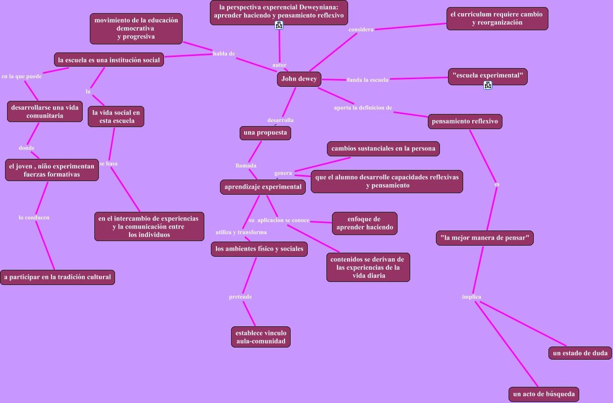 Este Cmap, tiene información relacionada con: 3.perspectiva experiencial, aprendizaje experimental su aplicacion se conoce contenidos se derivan de las experiencias de la vida diaria, la escuela es una institución social la la vida social en esta escuela, John dewey aporta la definicion de pensamiento reflexivo, John dewey habla de movimiento de la educación democrativa y progresiva, una propuesta llamada aprendizaje experimental, John dewey considera el curriculum requiere cambio y reorganización, los ambientes físico y sociales pretende establece vinculo aula-comunidad, "la mejor manera de pensar" implica un acto de búsqueda, John dewey habla de la escuela es una institución social, el joven , niño experimentan fuerzas formativas lo conducen a participar en la tradición cultural, desarrollarse una vida comunitaria donde el joven , niño experimentan fuerzas formativas, John dewey desarrolla una propuesta, aprendizaje experimental genera que el alumno desarrolle capacidades reflexivas y pensamiento, aprendizaje experimental genera cambios sustanciales en la persona, la perspectiva experencial Deweyniana: aprender haciendo y pensamiento reflexivo autor John dewey, aprendizaje experimental utiliza y transforma los ambientes físico y sociales, la vida social en esta escuela se basa en el intercambio de experiencias y la comunicación entre los individuos, pensamiento reflexivo es "la mejor manera de pensar", la escuela es una institución social en la que puede desarrollarse una vida comunitaria, John dewey funda la escuela "escuela experimental"