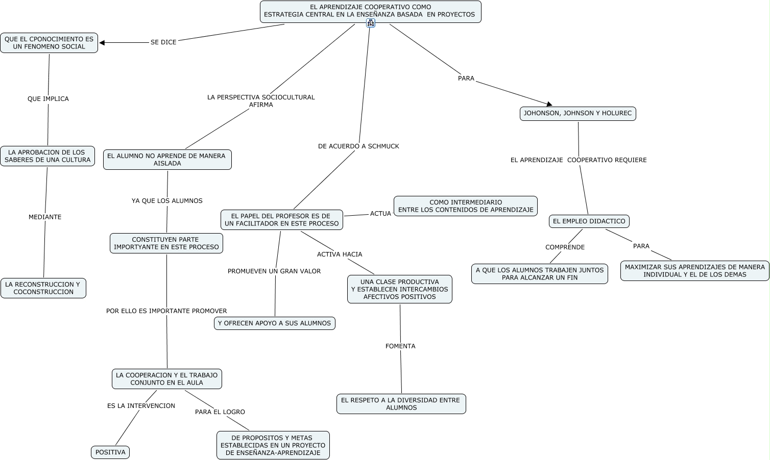 Este Cmap, tiene información relacionada con: EL APRENDIZAJE COLABORATIVO SEGUNDA PARTE CAPITULO 2, CONSTITUYEN PARTE IMPORTYANTE EN ESTE PROCESO POR ELLO ES IMPORTANTE PROMOVER LA COOPERACION Y EL TRABAJO CONJUNTO EN EL AULA, EL EMPLEO DIDACTICO PARA MAXIMIZAR SUS APRENDIZAJES DE MANERA INDIVIDUAL Y EL DE LOS DEMAS, JOHONSON, JOHNSON Y HOLUREC EL APRENDIZAJE COOPERATIVO REQUIERE EL EMPLEO DIDACTICO, UNA CLASE PRODUCTIVA Y ESTABLECEN INTERCAMBIOS AFECTIVOS POSITIVOS FOMENTA EL RESPETO A LA DIVERSIDAD ENTRE ALUMNOS, EL EMPLEO DIDACTICO COMPRENDE A QUE LOS ALUMNOS TRABAJEN JUNTOS PARA ALCANZAR UN FIN, LA COOPERACION Y EL TRABAJO CONJUNTO EN EL AULA ES LA INTERVENCION POSITIVA, EL APRENDIZAJE COOPERATIVO COMO ESTRATEGIA CENTRAL EN LA ENSEÑANZA BASADA EN PROYECTOS PARA JOHONSON, JOHNSON Y HOLUREC, LA APROBACION DE LOS SABERES DE UNA CULTURA MEDIANTE LA RECONSTRUCCION Y COCONSTRUCCION, EL APRENDIZAJE COOPERATIVO COMO ESTRATEGIA CENTRAL EN LA ENSEÑANZA BASADA EN PROYECTOS DE ACUERDO A SCHMUCK EL PAPEL DEL PROFESOR ES DE UN FACILITADOR EN ESTE PROCESO, EL APRENDIZAJE COOPERATIVO COMO ESTRATEGIA CENTRAL EN LA ENSEÑANZA BASADA EN PROYECTOS SE DICE QUE EL CPONOCIMIENTO ES UN FENOMENO SOCIAL, LA COOPERACION Y EL TRABAJO CONJUNTO EN EL AULA PARA EL LOGRO DE PROPOSITOS Y METAS ESTABLECIDAS EN UN PROYECTO DE ENSEÑANZA-APRENDIZAJE, EL PAPEL DEL PROFESOR ES DE UN FACILITADOR EN ESTE PROCESO PROMUEVEN UN GRAN VALOR Y OFRECEN APOYO A SUS ALUMNOS, EL APRENDIZAJE COOPERATIVO COMO ESTRATEGIA CENTRAL EN LA ENSEÑANZA BASADA EN PROYECTOS LA PERSPECTIVA SOCIOCULTURAL AFIRMA EL ALUMNO NO APRENDE DE MANERA AISLADA, QUE EL CPONOCIMIENTO ES UN FENOMENO SOCIAL QUE IMPLICA LA APROBACION DE LOS SABERES DE UNA CULTURA, EL PAPEL DEL PROFESOR ES DE UN FACILITADOR EN ESTE PROCESO ACTIVA HACIA UNA CLASE PRODUCTIVA Y ESTABLECEN INTERCAMBIOS AFECTIVOS POSITIVOS, EL ALUMNO NO APRENDE DE MANERA AISLADA YA QUE LOS ALUMNOS CONSTITUYEN PARTE IMPORTYANTE EN ESTE PROCESO, EL PAPEL DEL PROFESOR ES DE UN FACILITADOR EN ESTE PROCESO ACTUA COMO INTERMEDIARIO ENTRE LOS CONTENIDOS DE APRENDIZAJE
