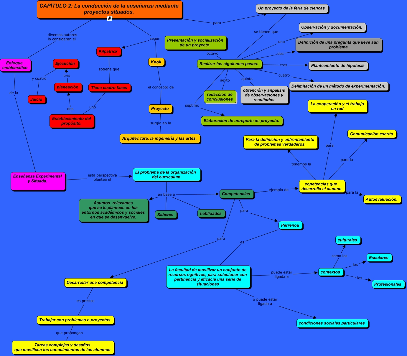 Este Cmap, tiene información relacionada con: CAPITULO 2 del libro Enseñanza Situada, Tiene cuatro fases uno Establecimiento del propósito., CAPÍTULO 2: La conducción de la enseñanza mediante proyectos situados. según Knoll, Realizar los siguientes pasos: dos Definición de una pregunta que lleve aun problema, Competencias para Desarrollar una competencia, contextos los Profesionales, Desarrollar una competencia es preciso Trabajar con problemas o proyectos, Enseñanza Experimental y Situada. esta perspectiva plantea el El problema de la organización del curriculum, Kilpatrick sotiene que Tiene cuatro fases, CAPÍTULO 2: La conducción de la enseñanza mediante proyectos situados. diversos autores lo consideran el Enfoque emblemático, Knoll el concepto de Proyecto, copetencias que desarrolla el alumno para la Autoevaluación., Enfoque emblemático de la Enseñanza Experimental y Situada., copetencias que desarrolla el alumno tenemos la Para la definición y enfrentamiento de problemas verdaderos., Realizar los siguientes pasos: uno Observación y documentación., contextos los Escolares, Establecimiento del propósito. dos planeación, Un proyecto de la feria de ciencas se tienen que Realizar los siguientes pasos:, El problema de la organización del curriculum en base a Competencias, El problema de la organización del curriculum en base a Asuntos relevantes que se le planteen en los entornos académicos y sociales en que se desenvuelve., Trabajar con problemas o proyectos que propongan Tareas complejas y desafíos que movilicen los conocimientos de los alumnos
