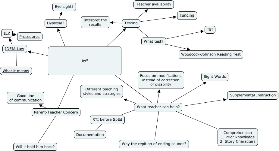 This Concept Map, created with IHMC CmapTools, has information related to: PrincipalA3, IDEIA Law ???? IEP, What teacher can help? ???? Different teaching styles and strategies, IDEIA Law ???? What it means, What teacher can help? ???? Supplemental Instruction, Jeff ???? Testing, Parent-Teacher Concern ???? Will it hold him back?, What teacher can help? ???? Comprehension 1. Prior knowledge 2. Story Characters, Parent-Teacher Concern ???? Good line of communication, What test? ???? Woodcock-Johnson Reading Test, Jeff ???? What teacher can help?, Jeff ???? Parent-Teacher Concern, What teacher can help? ???? Sight Words, Testing ???? Funding, Jeff ???? IDEIA Law, What teacher can help? ???? Why the repition of ending sounds?, What teacher can help? ???? Focus on modifications instead of correction of disability, RTI before SpEd ???? Documentation, Testing ???? What test?, Dyslexia? ???? Eye sight?, What teacher can help? ???? RTI before SpEd