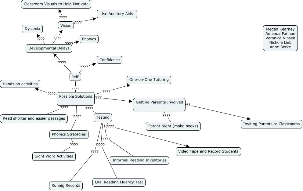 This Concept Map, created with IHMC CmapTools, has information related to: Teacher (Group B3), Possible Solutions ???? Hands on activities, Possible Solutions ???? One-on-One Tutoring, Getting Paretnts Involved ???? Parent Night (make books), Developmental Delays ???? Vision, Possible Solutions ???? Getting Paretnts Involved, Testing ???? Informal Reading Inventories, Testing ???? Runnig Records, Testing ???? Oral Reading Fluency Test, Developmental Delays ???? Phonics, Vision ???? Classroom Visuals to Help Motivate, Developmental Delays ???? Dyslexia, Jeff ???? Possible Solutions, Phonics Strategies ???? Sight Word Activities, Getting Paretnts Involved ???? Inviting Parents to Classrooms, Possible Solutions ???? Phonics Strategies, Possible Solutions ???? Testing, Vision ???? Use Auditory Aids, Jeff ???? Developmental Delays, Jeff ???? Confidence, Testing ???? Video Tape and Record Students