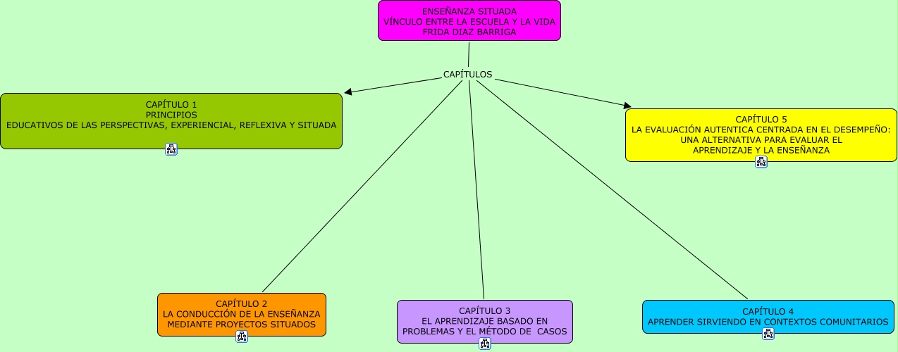 Este Cmap, tiene información relacionada con: MENU PRINCIPAL, ENSEÑANZA SITUADA VÍNCULO ENTRE LA ESCUELA Y LA VIDA FRIDA DIAZ BARRIGA CAPÍTULOS CAPÍTULO 4 APRENDER SIRVIENDO EN CONTEXTOS COMUNITARIOS, ENSEÑANZA SITUADA VÍNCULO ENTRE LA ESCUELA Y LA VIDA FRIDA DIAZ BARRIGA CAPÍTULOS CAPÍTULO 5 LA EVALUACIÓN AUTENTICA CENTRADA EN EL DESEMPEÑO: UNA ALTERNATIVA PARA EVALUAR EL APRENDIZAJE Y LA ENSEÑANZA, ENSEÑANZA SITUADA VÍNCULO ENTRE LA ESCUELA Y LA VIDA FRIDA DIAZ BARRIGA CAPÍTULOS CAPÍTULO 2 LA CONDUCCIÓN DE LA ENSEÑANZA MEDIANTE PROYECTOS SITUADOS, ENSEÑANZA SITUADA VÍNCULO ENTRE LA ESCUELA Y LA VIDA FRIDA DIAZ BARRIGA CAPÍTULOS CAPÍTULO 1 PRINCIPIOS EDUCATIVOS DE LAS PERSPECTIVAS, EXPERIENCIAL, REFLEXIVA Y SITUADA, ENSEÑANZA SITUADA VÍNCULO ENTRE LA ESCUELA Y LA VIDA FRIDA DIAZ BARRIGA CAPÍTULOS CAPÍTULO 3 EL APRENDIZAJE BASADO EN PROBLEMAS Y EL MÉTODO DE CASOS