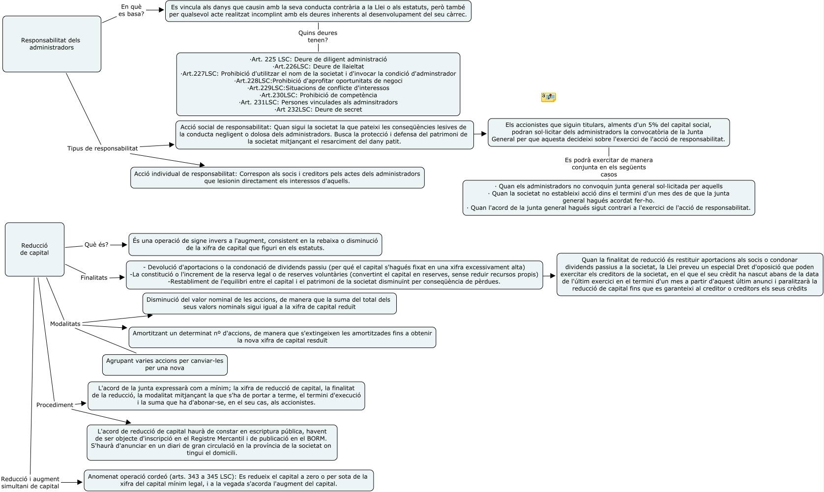 Este Cmap, tiene información relacionada con: escenari 10, Reducció de capital Reducció i augment simultani de capital Anomenat operació cordeó (arts. 343 a 345 LSC): Es redueix el capital a zero o per sota de la xifra del capital mínim legal, i a la vegada s'acorda l'augment del capital., Reducció de capital Modalitats Agrupant varies accions per canviar-les per una nova, Reducció de capital Què és? És una operació de signe invers a l'augment, consistent en la rebaixa o disminució de la xifra de capital que figuri en els estatuts., Reducció de capital Finalitats - Devolució d'aportacions o la condonació de dividends passiu (per qué el capital s'hagués fixat en una xifra excessivament alta) -La constitució o l'increment de la reserva legal o de reserves voluntàries (convertint el capital en reserves, sense reduir recursos propis) -Restabliment de l'equilibri entre el capital i el patrimoni de la societat disminuïnt per conseqüència de pèrdues., Reducció de capital Modalitats Disminució del valor nominal de les accions, de manera que la suma del total dels seus valors nominals sigui igual a la xifra de capital reduït, Responsabilitat dels administradors Tipus de responsabilitat Acció social de responsabilitat: Quan sigui la societat la que pateixi les conseqüències lesives de la conducta negligent o dolosa dels administradors. Busca la protecció i defensa del patrimoni de la societat mitjançant el resarciment del dany patit., Reducció de capital Procediment L'acord de reducció de capital haurà de constar en escriptura pública, havent de ser objecte d'inscripció en el Registre Mercantil i de publicació en el BORM. S'haurà d'anunciar en un diari de gran circulació en la província de la societat on tingui el domicili., Els accionistes que siguin titulars, alments d'un 5% del capital social, podran sol·licitar dels administradors la convocatòria de la Junta General per que aquesta decideixi sobre l'exercici de l'acció de responsabilitat. Es podrà exercitar de manera conjunta en els següents casos · Quan els administradors no convoquin junta general sol·licitada per aquells · Quan la societat no estableixi acció dins el termini d'un mes des de que la junta general hagués acordat fer-ho. · Quan l'acord de la junta general hagués sigut contrari a l'exercici de l'acció de responsabilitat., Reducció de capital Procediment L'acord de la junta expressarà com a mínim; la xifra de reducció de capital, la finalitat de la reducció, la modalitat mitjançant la que s'ha de portar a terme, el termini d'execució i la suma que ha d'abonar-se, en el seu cas, als accionistes., Acció social de responsabilitat: Quan sigui la societat la que pateixi les conseqüències lesives de la conducta negligent o dolosa dels administradors. Busca la protecció i defensa del patrimoni de la societat mitjançant el resarciment del dany patit. ???? Els accionistes que siguin titulars, alments d'un 5% del capital social, podran sol·licitar dels administradors la convocatòria de la Junta General per que aquesta decideixi sobre l'exercici de l'acció de responsabilitat., Es vincula als danys que causin amb la seva conducta contrària a la Llei o als estatuts, però també per qualsevol acte realitzat incomplint amb els deures inherents al desenvolupament del seu càrrec. Quins deures tenen? ·Art. 225 LSC: Deure de diligent administració ·Art.226LSC: Deure de llaieltat ·Art.227LSC: Prohibició d'utilitzar el nom de la societat i d'invocar la condició d'adminstrador ·Art.228LSC:Prohibició d'aprofitar oportunitats de negoci ·Art.229LSC:Situacions de conflicte d'interessos ·Art.230LSC: Prohibició de competència ·Art. 231LSC: Persones vinculades als adminsitradors ·Art 232LSC: Deure de secret, Reducció de capital Modalitats Amortitzant un determinat nº d'accions, de manera que s'extingeixen les amortitzades fins a obtenir la nova xifra de capital resduït, Responsabilitat dels administradors En què es basa? Es vincula als danys que causin amb la seva conducta contrària a la Llei o als estatuts, però també per qualsevol acte realitzat incomplint amb els deures inherents al desenvolupament del seu càrrec., - Devolució d'aportacions o la condonació de dividends passiu (per qué el capital s'hagués fixat en una xifra excessivament alta) -La constitució o l'increment de la reserva legal o de reserves voluntàries (convertint el capital en reserves, sense reduir recursos propis) -Restabliment de l'equilibri entre el capital i el patrimoni de la societat disminuïnt per conseqüència de pèrdues. ???? Quan la finalitat de reducció és restituir aportacions als socis o condonar dividends passius a la societat, la Llei preveu un especial Dret d'oposició que poden exercitar els creditors de la societat, en el que el seu crèdit ha nascut abans de la data de l'últim exercici en el termini d'un mes a partir d'aquest últim anunci i paralitzarà la reducció de capital fins que es garanteixi al creditor o creditors els seus crèdits, Responsabilitat dels administradors Tipus de responsabilitat Acció individual de responsabilitat: Correspon als socis i creditors pels actes dels administradors que lesionin directament els interessos d'aquells.