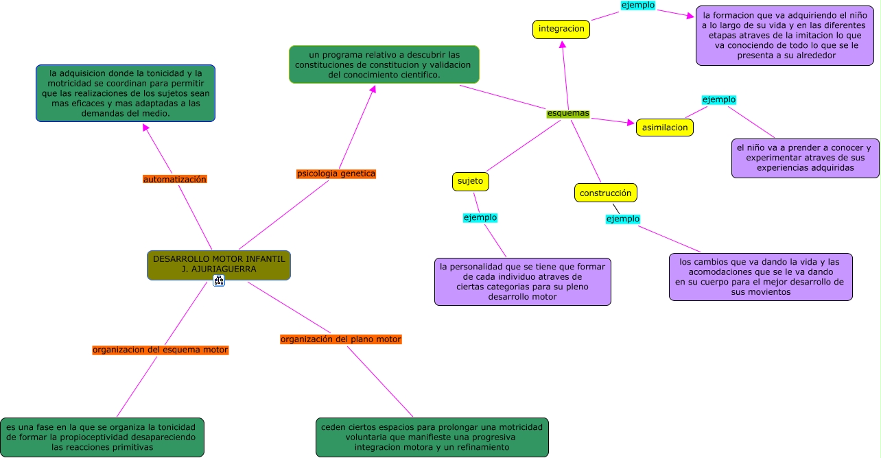 Este Cmap, tiene información relacionada con: desarrollo motor infantil, asimilacion ejemplo el niño va a prender a conocer y experimentar atraves de sus experiencias adquiridas, DESARROLLO MOTOR INFANTIL J. AJURIAGUERRA automatización la adquisicion donde la tonicidad y la motricidad se coordinan para permitir que las realizaciones de los sujetos sean mas eficaces y mas adaptadas a las demandas del medio., construcción ejemplo los cambios que va dando la vida y las acomodaciones que se le va dando en su cuerpo para el mejor desarrollo de sus movientos, integracion ejemplo la formacion que va adquiriendo el niño a lo largo de su vida y en las diferentes etapas atraves de la imitacion lo que va conociendo de todo lo que se le presenta a su alrededor, DESARROLLO MOTOR INFANTIL J. AJURIAGUERRA psicologia genetica un programa relativo a descubrir las constituciones de constitucion y validacion del conocimiento cientifico., DESARROLLO MOTOR INFANTIL J. AJURIAGUERRA organizacion del esquema motor es una fase en la que se organiza la tonicidad de formar la propioceptividad desapareciendo las reacciones primitivas, un programa relativo a descubrir las constituciones de constitucion y validacion del conocimiento cientifico. esquemas integracion, DESARROLLO MOTOR INFANTIL J. AJURIAGUERRA organización del plano motor ceden ciertos espacios para prolongar una motricidad voluntaria que manifieste una progresiva integracion motora y un refinamiento, un programa relativo a descubrir las constituciones de constitucion y validacion del conocimiento cientifico. esquemas asimilacion, un programa relativo a descubrir las constituciones de constitucion y validacion del conocimiento cientifico. esquemas construcción, sujeto ejemplo la personalidad que se tiene que formar de cada individuo atraves de ciertas categorias para su pleno desarrollo motor, un programa relativo a descubrir las constituciones de constitucion y validacion del conocimiento cientifico. esquemas sujeto