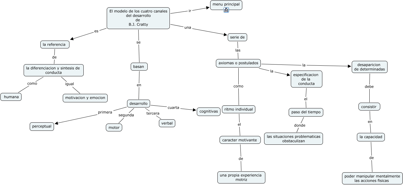 Este Cmap, tiene información relacionada con: Copia de septimo mapa, especificacion de la conducta el paso del tiempo, axiomas o postulados como ritmo individual, El modelo de los cuatro canales del desarrollo de B.J. Cratty ir menu principal, paso del tiempo donde las situaciones problematicas obstaculizan, desarrollo cuarta cognitivas, la referencia de la diferenciacion y sintesis de conducta, la capacidad de poder manipular mentalmente las acciones fisicas, la diferenciacion y sintesis de conducta como humana, la diferenciacion y sintesis de conducta igual motivacion y emocion, axiomas o postulados la desaparicion de determinadas, serie de las axiomas o postulados, basan en desarrollo, desarrollo segunda motor, El modelo de los cuatro canales del desarrollo de B.J. Cratty se basan, ritmo individual el caracter motivante, caracter motivante de una propia experiencia motriz, El modelo de los cuatro canales del desarrollo de B.J. Cratty es la referencia, axiomas o postulados la especificacion de la conducta, desaparicion de determinadas debe consistir, consistir en la capacidad