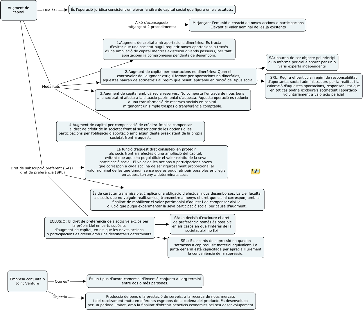 Este Cmap, tiene información relacionada con: escenari 8 mercantil 2, Augment de capital Què és? És l'operació jurídica consistent en elevar la xifra de capital social que figura en els estatuts., ECLUSIÓ: El dret de preferència dels socis ve exclòs per la pròpia Llei en certs supòsits d'augment de capital, en els que les noves accions o participacions es creein amb uns destinataris determinats. ???? SA:La decisió d'excloure el dret de preferència només és possible en els casos en que l'interès de la societat així ho fixi., 2.Augment de capital per aportacions no dineràries: Quan el contravalor de l'augment estigui format per aportacions no dineràries, aquestes hauran de sotmetre's al règim que resulti aplicable en funció del tipus social. ???? SA: hauran de ser objecte pel principi d'un informe pericial elaborat per un o varis experts independents, Augment de capital Modalitats 4.Augment de capital per compensació de crèdits: Implica compensar el dret de crèdit de la societat front al subscriptor de les accions o les participacions per l'obligació d'aportació amb algun deute preexistent de la pròpia societat front a aquest., Augment de capital Dret de subscripció preferent (SA) i dret de preferència (SRL) ECLUSIÓ: El dret de preferència dels socis ve exclòs per la pròpia Llei en certs supòsits d'augment de capital, en els que les noves accions o participacions es creein amb uns destinataris determinats., 2.Augment de capital per aportacions no dineràries: Quan el contravalor de l'augment estigui format per aportacions no dineràries, aquestes hauran de sotmetre's al règim que resulti aplicable en funció del tipus social. ???? SRL: Regirà el particular règim de responsabilitat d'aportants, socis i administradors per la realitat i la caloració d'aquestes aportacions, responsabilitat que en tot cas podria excloure's sotmetent l'aportació voluntàriament a valoració pericial, Augment de capital Modalitats 3.Augment de capital amb càrrec a reserves: No comporta l'entrada de nous béns a la societat ni afecta a la situació patrimonial d'aquesta. Aquesta operació es redueix a una transformació de reserves socials en capital mitjançant un simple traspàs o transferència comptable., Augment de capital Dret de subscripció preferent (SA) i dret de preferència (SRL) És de caràcter transmissible. Implica una obligació d'efectuar nous desemborsos. La Llei faculta als socis que no vulguin realitzar-los, transmetre almenys el dret que els hi correspon, amb la finalitat de mobilitzar el valor patrimonial d'aquest i de compensar així la dilució que pugui experimentar la seva participació social per causa d'augment., És l'operació jurídica consistent en elevar la xifra de capital social que figura en els estatuts. Això s'aconsegueix mitjançant 2 procediments: ·Mitjançant l'emissió o creació de noves accions o participacions ·Elevant el valor nominal de les ja existents, Empresa conjunta o Joint Venture Objectiu Producció de béns o la prestació de serveis, a la recerca de nous mercats i del recolzament mútu en diferents esgraons de la cadena del producte.Es desenvolupa per un període limitat, amb la finalitat d'obtenir beneficis econòmics pel seu desenvolupament, Augment de capital Dret de subscripció preferent (SA) i dret de preferència (SRL) La funció d'aquest dret consisteix en protegir als socis front als efectes d'una ampliació del capital, evitant que aquesta pugui diluir el valor relatiu de la seva participació social. El valor de les accions o participacions noves que correspon a cada soci ha de ser rigurosament proporcional al valor nominal de les que tingui, sense que es pugui atribuir possibles privilegis en aquest terreny a determinats socis., Empresa conjunta o Joint Venture Què és? És un tipus d'acord comercial d'inversió conjunta a llarg termini entre dos o més persones., ECLUSIÓ: El dret de preferència dels socis ve exclòs per la pròpia Llei en certs supòsits d'augment de capital, en els que les noves accions o participacions es creein amb uns destinataris determinats. ???? SRL: Els acords de supressió no queden sotmesos a cap requisit material equivalent. La junta general està capacitada per aprecia lliurement la conveniència de la supressió., Augment de capital Modalitats 1.Augment de capital amb aportacions dineràries: Es tracta d'evitar que una societat pugui requerir noves aportacions a través d'una ampliació de capital mentres existeixin divends passius i, per tant, aportacions ja compromeses pendents de desembors., Augment de capital Modalitats 2.Augment de capital per aportacions no dineràries: Quan el contravalor de l'augment estigui format per aportacions no dineràries, aquestes hauran de sotmetre's al règim que resulti aplicable en funció del tipus social.