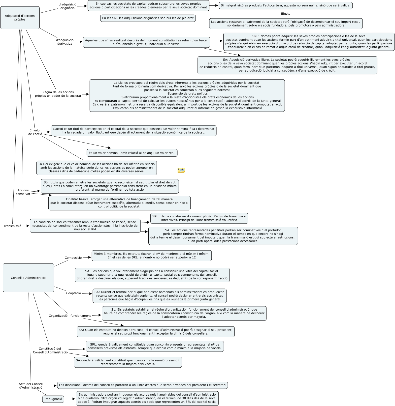 Este Cmap, tiene información relacionada con: escenari 7, Aquelles que s'han realitzat després del moment constitutiu i es reben d'un tercer a títol onerós o gratuït, individual o universal ???? SRL: Només podrà adquirir les seves pròpies participacions o les de la seva societat dominant quan les accions formin part d'un patrimoni adquirit a títol universal, quan les participacions pròpies s'adquireixin en execució d'un acord de reducció de capital adoptat per la junta, quan les participacions s'adquireixin en el cas de remat o adjudicació de creditor, quan l'adquisició l'hagi autoritzat la junta general., Adquisició d'accions pròpies Transmissió La condició de soci es transmet amb la transmissió de l'acció, sense necessitat del consentiment de la resta d'accionistes ni la inscripció del nou soci al RM, Adquisició d'accions pròpies d'adquisició originària En cap cas les societats de capital podran subscriure les seves pròpies accions o participacions ni les creades o emeses per la seva societat dominant, Adquisició d'accions pròpies Règim de les accions pròpies en poder de la societat La Llei es preocupa pel règim dels drets inherents a les accions pròpies adquirides per la societat tant de forma originària com derivativa. Per això les accions pròpies o de la societat dominant que posseeixi la societat es sometran a les següents normes: ·Suspensió de drets polítics ·S'atribuiran proporcionalment a la resta d'accionistes els drets econòmics de les accions ·Es computaran al capital per tal de calcular les quotes necessàries per a la constitució i adopció d'acords de la junta general ·Es crearà al patrimoni net una reserva disponible equivalent al import de les accions de la societat dominant computat al actiu ·Explicaran els administradors de la societat adquirent al informe de gestió la exhaustiva informació, Adquisició d'accions pròpies d'adquisició derivativa Aquelles que s'han realitzat després del moment constitutiu i es reben d'un tercer a títol onerós o gratuït, individual o universal, Adquisició d'accions pròpies El valor de l'acció L'acció és un títol de participació en el capital de la societat que posseeix un valor nominal fixa i determinat i a la vegada un valor fluctuant que depèn directament de la situació econòmica de la societat., Consell d'Administració Constitució del Consell d'Administració SA:quedarà vàlidament constituït quan concorri a la reunió present i representants la majora dels vocals., Consell d'Administració Acte del Consell d'Administració Impugnació, Consell d'Administració Organització i funcionament SL: Els estatuts establiran el règim d'organització i funcionament del consell d'administració, que haurà de comprendre les regles de la convocatòria i constitució de l'òrgan, així com la manera de deliberar i adoptar acords per majoria., Consell d'Administració Organització i funcionament SA: Quan els estatuts no diposin altra cosa, el consell d'administració podrà designar al seu president, regular el seu propi funcionament i acceptar la dimisió dels consellers., Aquelles que s'han realitzat després del moment constitutiu i es reben d'un tercer a títol onerós o gratuït, individual o universal ???? SA: Adquisició derivativa lliure. La societat podrà adquirir lliurement les eves pròpies accions o les de la seva societat dominant quan les pròpies accions s'hagin adquirit per executar un acord de reducció de capital, quan formi part d'un patrimoni adquirit a títol universal, quan siguin adquirides a títol gratuït, per adjudicació judicial a conseqüència d'una execució de crèdit., Mínim 3 membres. Els estatuts fixaran el nº de menbres o el màxim i mínim. En el cas de les SRL, el nombre no podrà ser superior a 12 SA: Les accions que voluntàriament s'agrupin fins a constituir una xifra del capital social igual o superior a la que resulti de dividir el capital social pels components del consell, tindran dret a desginar els que, superant fraccions senceres, es dedueixin de la corresponent fracció, Adquisició d'accions pròpies El valor de l'acció La Llei exigeix que el valor nominal de les accions ha de ser idèntic en relació amb les accions de la mateixa sèrie doncs les accions es poden agrupar en classes i dins de cadascuna d'elles poden existir diverses sèries., Consell d'Administració Cooptació SA: Durant el termini per el que han estat nomenats els adminsitradors es produeixen vacants sense que existeixin suplents, el consell podrà designar entre els accionistes les persones que hagin d'ocupar-les fins que es reuneixi la primera junta general, Consell d'Administració Constitució del Consell d'Administració SRL: quedarà vàlidament constituïda quan concorrin presents o representats, el nº de consellers previstos als estatuts, sempre que arribin com a mínim a la majoria de vocals., Adquisició d'accions pròpies Accions sense vot Finalitat bàsica: atorgar una alternativa de finançament, de tal manera que la societat disposa d0un instrument específic, alternatiu al crèdit, sense posar en risc el control polític de la societat., La condició de soci es transmet amb la transmissió de l'acció, sense necessitat del consentiment de la resta d'accionistes ni la inscripció del nou soci al RM ???? SRL: Ha de constar en document públic. Règim de transmissió inter vivos. Principi de lliure transmissió voluntària, Impugnació ???? Els administradors podran impugnar els acords nuls i anul·lables del consell d'administració o de qualsevol altre òrgan col·legiat d'administració, en el termini de 30 dies des de la seva adopció. Podran impugnar aquests acords els socis que representen un 5% del capital social, En cap cas les societats de capital podran subscriure les seves pròpies accions o participacions ni les creades o emeses per la seva societat dominant ???? Si malgrat això es produeix l'autocartera, aquesta no serà nul·la, 