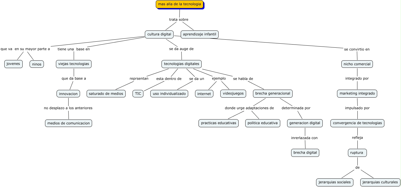This Concept Map, created with IHMC CmapTools, has information related to: capitulo 5 infancias digitals, nicho comercial integrado por marketing integrado, tecnologias digitales se da un uso individualizado, cultura digital que va en su mayor parte a jovenes, brecha generacional donde urge adaptaciones de politica educativa, mas alla de la tecnologia trata sobre cultura digital, viejas tecnologias que da base a innovacion, ruptura de jerarquias culturales, ruptura de jerarquias sociales, mas alla de la tecnologia trata sobre aprendizaje infantil, brecha generacional determinada por generacion digital, brecha generacional donde urge adaptaciones de practicas educativas, cultura digital se da auge de tecnologias digitales, innovacion no desplazo a los anteriores medios de comunicacion, generacion digital inrerlazada con brecha digital, tecnologias digitales ejemplo videojuegos, tecnologias digitales se habla de brecha generacional, convergencia de tecnologias refleja ruptura, cultura digital se convirtio en nicho comercial, marketing integrado impulsado por convergencia de tecnologias, tecnologias digitales esta dentro de TIC