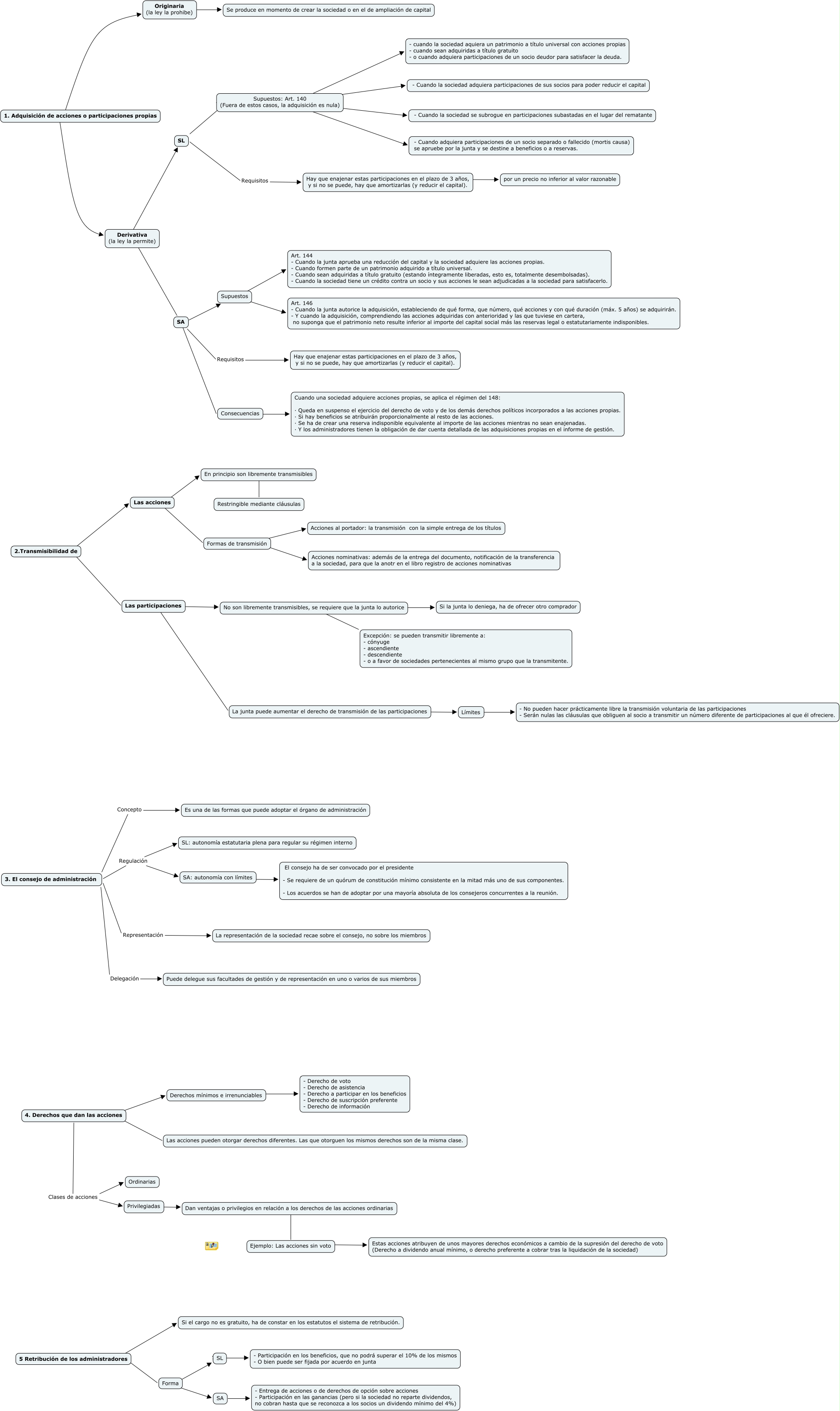 Este Cmap, tiene información relacionada con: Mercantil II - Caso 7, Las participaciones ???? La junta puede aumentar el derecho de transmisión de las participaciones, Supuestos ???? Art. 144 - Cuando la junta aprueba una reducción del capital y la sociedad adquiere las acciones propias. - Cuando formen parte de un patrimonio adquirido a título universal. - Cuando sean adquiridas a título gratuito (estando íntegramente liberadas, esto es, totalmente desembolsadas). - Cuando la sociedad tiene un crédito contra un socio y sus acciones le sean adjudicadas a la sociedad para satisfacerlo., 3. El consejo de administración Concepto Es una de las formas que puede adoptar el órgano de administración, Ejemplo: Las acciones sin voto ???? Estas acciones atribuyen de unos mayores derechos económicos a cambio de la supresión del derecho de voto (Derecho a dividendo anual mínimo, o derecho preferente a cobrar tras la liquidación de la sociedad), 4. Derechos que dan las acciones Clases de acciones Privilegiadas, Derechos mínimos e irrenunciables ???? - Derecho de voto - Derecho de asistencia - Derecho a participar en los beneficios - Derecho de suscripción preferente - Derecho de información, SA Requisitos Hay que enajenar estas participaciones en el plazo de 3 años, y si no se puede, hay que amortizarlas (y reducir el capital)., 2.Transmisibilidad de ???? Las participaciones, 4. Derechos que dan las acciones ???? Derechos mínimos e irrenunciables, 4. Derechos que dan las acciones Clases de acciones Ordinarias, SL ???? Supuestos: Art. 140 (Fuera de estos casos, la adquisición es nula), Formas de transmisión ???? Acciones nominativas: además de la entrega del documento, notificación de la transferencia a la sociedad, para que la anotr en el libro registro de acciones nominativas, 3. El consejo de administración Regulación SL: autonomía estatutaria plena para regular su régimen interno, Consecuencias ???? Cuando una sociedad adquiere acciones propias, se aplica el régimen del 148: · Queda en suspenso el ejercicio del derecho de voto y de los demás derechos políticos incorporados a las acciones propias. · Si hay beneficios se atribuirán proporcionalmente al resto de las acciones. · Se ha de crear una reserva indisponible equivalente al importe de las acciones mientras no sean enajenadas. · Y los administradores tienen la obligación de dar cuenta detallada de las adquisiciones propias en el informe de gestión., 2.Transmisibilidad de ???? Las acciones, Hay que enajenar estas participaciones en el plazo de 3 años, y si no se puede, hay que amortizarlas (y reducir el capital). ???? por un precio no inferior al valor razonable, 3. El consejo de administración Regulación SA: autonomía con límites, 3. El consejo de administración Representación La representación de la sociedad recae sobre el consejo, no sobre los miembros, Forma ???? SA, SA ???? Consecuencias