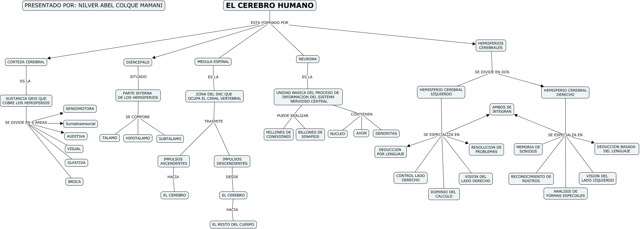 Este Cmap, tiene información relacionada con: MAPA CEREBRO, SUSTANCIA GRIS QUE CUBRE LOS HEMISFERIOS SE DIVIDE EN 6 AREAS Somatosensorial, UNIDAD BASICA DEL PROCESO DE INFORMACION DEL SISTEMA NERVIOSO CENTRAL PUEDE REALIZAR BILLONES DE SINAPSIS, UNIDAD BASICA DEL PROCESO DE INFORMACION DEL SISTEMA NERVIOSO CENTRAL CONTIENEN NUCLEO, EL CEREBRO HUMANO ESTA FORMADO POR MEDULA ESPINAL, DIENCEFALO SITUADO PARTE INTERNA DE LOS HEMISFERIOS, NEURONA ES LA UNIDAD BASICA DEL PROCESO DE INFORMACION DEL SISTEMA NERVIOSO CENTRAL, SUSTANCIA GRIS QUE CUBRE LOS HEMISFERIOS SE DIVIDE EN 6 AREAS OLFATIVA, HEMISFERIO CEREBRAL DERECHO SE ESPECIALZA EN RECONOCIMIENTO DE ROSTROS, HEMISFERIOS CEREBRALES SE DIVIDE EN DOS HEMISFERIO CEREBRAL IZQUIERDO, ZONA DEL SNC QUE OCUPA EL CANAL VERTEBRAL TRASMITE IMPULSOS ASCENDENTES, SUSTANCIA GRIS QUE CUBRE LOS HEMISFERIOS SE DIVIDE EN 6 AREAS VISUAL, MEDULA ESPINAL ES LA ZONA DEL SNC QUE OCUPA EL CANAL VERTEBRAL, HEMISFERIO CEREBRAL DERECHO SE ESPECIALZA EN MEMORIA DE SONIDOS, HEMISFERIO CEREBRAL DERECHO SE ESPECIALZA EN ANALISIS DE FORMAS ESPECIALES, PARTE INTERNA DE LOS HEMISFERIOS SE COMPONE HIPOTALAMO, HEMISFERIO CEREBRAL IZQUIERDO SE ESPECIALIZA EN DOMINIO DEL CALCULO, UNIDAD BASICA DEL PROCESO DE INFORMACION DEL SISTEMA NERVIOSO CENTRAL CONTIENEN DENDRITAS, EL CEREBRO HACIA EL RESTO DEL CUERPO, EL CEREBRO HUMANO ESTA FORMADO POR DIENCEFALO, HEMISFERIO CEREBRAL IZQUIERDO SE ESPECIALIZA EN DEDUCCION POR LENGUAJE