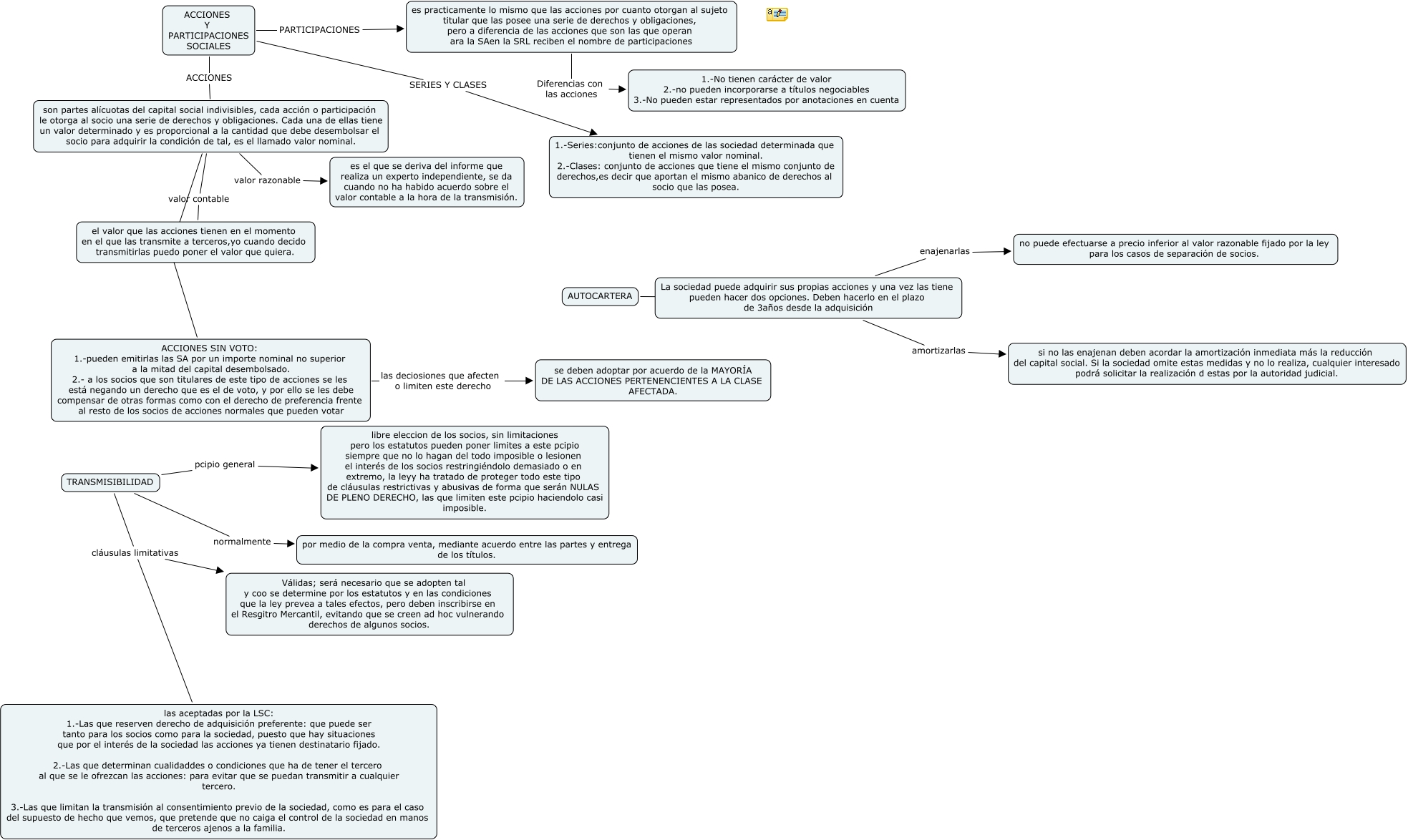 Este Cmap, tiene información relacionada con: CASO PRACTICO NUMERO 7, La sociedad puede adquirir sus propias acciones y una vez las tiene pueden hacer dos opciones. Deben hacerlo en el plazo de 3años desde la adquisición amortizarlas si no las enajenan deben acordar la amortización inmediata más la reducción del capital social. Si la sociedad omite estas medidas y no lo realiza, cualquier interesado podrá solicitar la realización d estas por la autoridad judicial., TRANSMISIBILIDAD cláusulas limitativas las aceptadas por la LSC: 1.-Las que reserven derecho de adquisición preferente: que puede ser tanto para los socios como para la sociedad, puesto que hay situaciones que por el interés de la sociedad las acciones ya tienen destinatario fijado. 2.-Las que determinan cualidaddes o condiciones que ha de tener el tercero al que se le ofrezcan las acciones: para evitar que se puedan transmitir a cualquier tercero. 3.-Las que limitan la transmisión al consentimiento previo de la sociedad, como es para el caso del supuesto de hecho que vemos, que pretende que no caiga el control de la sociedad en manos de terceros ajenos a la familia., ACCIONES Y PARTICIPACIONES SOCIALES ACCIONES son partes alícuotas del capital social indivisibles, cada acción o participación le otorga al socio una serie de derechos y obligaciones. Cada una de ellas tiene un valor determinado y es proporcional a la cantidad que debe desembolsar el socio para adquirir la condición de tal, es el llamado valor nominal., La sociedad puede adquirir sus propias acciones y una vez las tiene pueden hacer dos opciones. Deben hacerlo en el plazo de 3años desde la adquisición enajenarlas no puede efectuarse a precio inferior al valor razonable fijado por la ley para los casos de separación de socios., ACCIONES SIN VOTO: 1.-pueden emitirlas las SA por un importe nominal no superior a la mitad del capital desembolsado. 2.- a los socios que son titulares de este tipo de acciones se les está negando un derecho que es el de voto, y por ello se les debe compensar de otras formas como con el derecho de preferencia frente al resto de los socios de acciones normales que pueden votar las deciosiones que afecten o limiten este derecho se deben adoptar por acuerdo de la MAYORÍA DE LAS ACCIONES PERTENENCIENTES A LA CLASE AFECTADA., ACCIONES Y PARTICIPACIONES SOCIALES SERIES Y CLASES 1.-Series:conjunto de acciones de las sociedad determinada que tienen el mismo valor nominal. 2.-Clases: conjunto de acciones que tiene el mismo conjunto de derechos,es decir que aportan el mismo abanico de derechos al socio que las posea., TRANSMISIBILIDAD normalmente por medio de la compra venta, mediante acuerdo entre las partes y entrega de los títulos., es practicamente lo mismo que las acciones por cuanto otorgan al sujeto titular que las posee una serie de derechos y obligaciones, pero a diferencia de las acciones que son las que operan ara la SAen la SRL reciben el nombre de participaciones Diferencias con las acciones 1.-No tienen carácter de valor 2.-no pueden incorporarse a títulos negociables 3.-No pueden estar representados por anotaciones en cuenta, TRANSMISIBILIDAD cláusulas limitativas Válidas; será necesario que se adopten tal y coo se determine por los estatutos y en las condiciones que la ley prevea a tales efectos, pero deben inscribirse en el Resgitro Mercantil, evitando que se creen ad hoc vulnerando derechos de algunos socios., son partes alícuotas del capital social indivisibles, cada acción o participación le otorga al socio una serie de derechos y obligaciones. Cada una de ellas tiene un valor determinado y es proporcional a la cantidad que debe desembolsar el socio para adquirir la condición de tal, es el llamado valor nominal. valor razonable es el que se deriva del informe que realiza un experto independiente, se da cuando no ha habido acuerdo sobre el valor contable a la hora de la transmisión., son partes alícuotas del capital social indivisibles, cada acción o participación le otorga al socio una serie de derechos y obligaciones. Cada una de ellas tiene un valor determinado y es proporcional a la cantidad que debe desembolsar el socio para adquirir la condición de tal, es el llamado valor nominal. valor contable el valor que las acciones tienen en el momento en el que las transmite a terceros,yo cuando decido transmitirlas puedo poner el valor que quiera., son partes alícuotas del capital social indivisibles, cada acción o participación le otorga al socio una serie de derechos y obligaciones. Cada una de ellas tiene un valor determinado y es proporcional a la cantidad que debe desembolsar el socio para adquirir la condición de tal, es el llamado valor nominal. ???? ACCIONES SIN VOTO: 1.-pueden emitirlas las SA por un importe nominal no superior a la mitad del capital desembolsado. 2.- a los socios que son titulares de este tipo de acciones se les está negando un derecho que es el de voto, y por ello se les debe compensar de otras formas como con el derecho de preferencia frente al resto de los socios de acciones normales que pueden votar, TRANSMISIBILIDAD pcipio general libre eleccion de los socios, sin limitaciones pero los estatutos pueden poner limites a este pcipio siempre que no lo hagan del todo imposible o lesionen el interés de los socios restringiéndolo demasiado o en extremo, la leyy ha tratado de proteger todo este tipo de cláusulas restrictivas y abusivas de forma que serán NULAS DE PLENO DERECHO, las que limiten este pcipio haciendolo casi imposible., ACCIONES Y PARTICIPACIONES SOCIALES PARTICIPACIONES es practicamente lo mismo que las acciones por cuanto otorgan al sujeto titular que las posee una serie de derechos y obligaciones, pero a diferencia de las acciones que son las que operan ara la SAen la SRL reciben el nombre de participaciones, AUTOCARTERA La sociedad puede adquirir sus propias acciones y una vez las tiene pueden hacer dos opciones. Deben hacerlo en el plazo de 3años