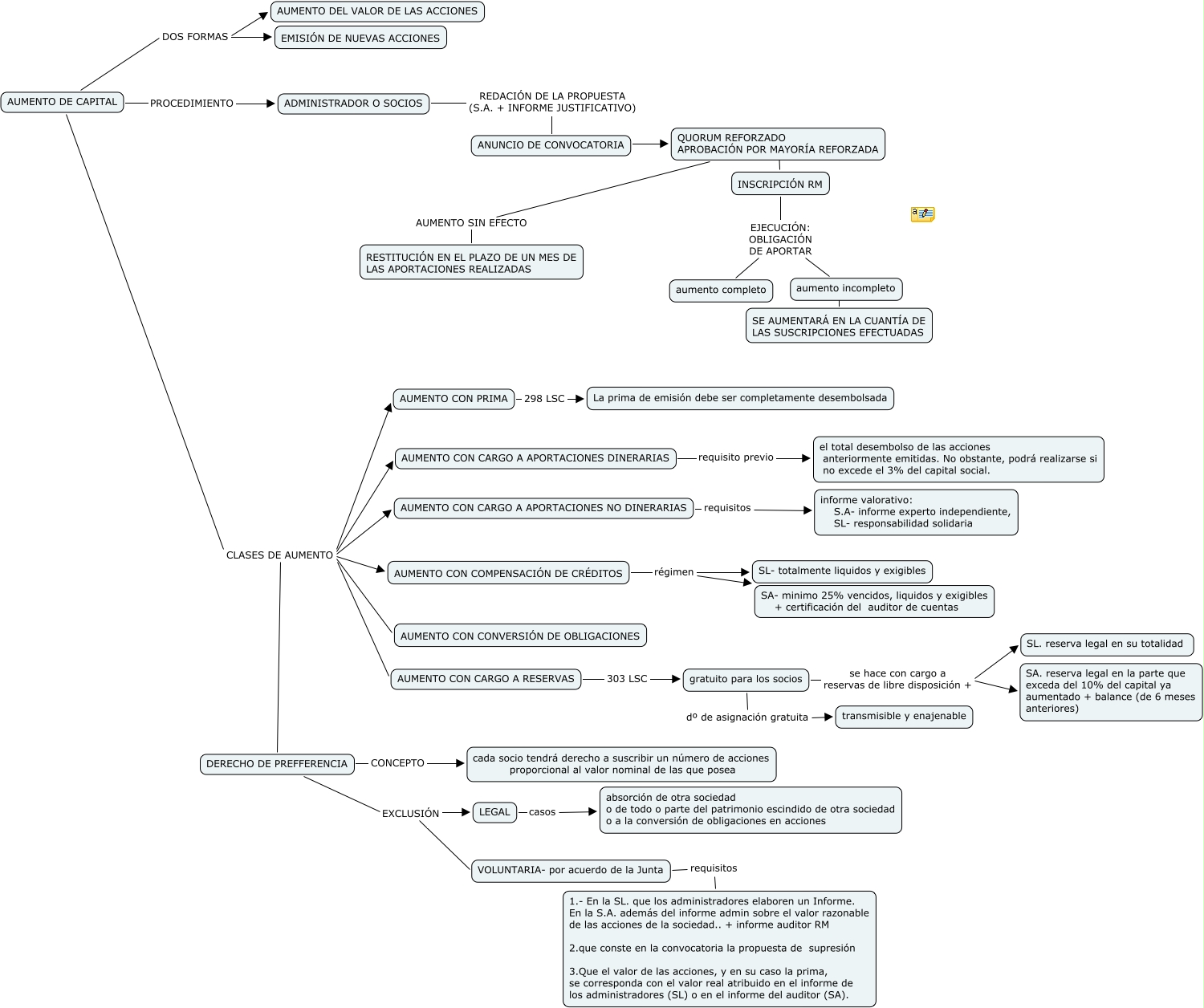 Este Cmap, tiene información relacionada con: CMAPS- ESCENARIO 8, INSCRIPCIÓN RM EJECUCIÓN: OBLIGACIÓN DE APORTAR aumento completo, AUMENTO DE CAPITAL CLASES DE AUMENTO AUMENTO CON PRIMA, AUMENTO DE CAPITAL CLASES DE AUMENTO AUMENTO CON COMPENSACIÓN DE CRÉDITOS, VOLUNTARIA- por acuerdo de la Junta requisitos 1.- En la SL. que los administradores elaboren un Informe. En la S.A. además del informe admin sobre el valor razonable de las acciones de la sociedad.. + informe auditor RM 2.que conste en la convocatoria la propuesta de supresión 3.Que el valor de las acciones, y en su caso la prima, se corresponda con el valor real atribuido en el informe de los administradores (SL) o en el informe del auditor (SA)., AUMENTO DE CAPITAL CLASES DE AUMENTO DERECHO DE PREFFERENCIA, QUORUM REFORZADO APROBACIÓN POR MAYORÍA REFORZADA ???? INSCRIPCIÓN RM, gratuito para los socios dº de asignación gratuita transmisible y enajenable, QUORUM REFORZADO APROBACIÓN POR MAYORÍA REFORZADA AUMENTO SIN EFECTO RESTITUCIÓN EN EL PLAZO DE UN MES DE LAS APORTACIONES REALIZADAS, LEGAL casos absorción de otra sociedad o de todo o parte del patrimonio escindido de otra sociedad o a la conversión de obligaciones en acciones, AUMENTO DE CAPITAL CLASES DE AUMENTO AUMENTO CON CONVERSIÓN DE OBLIGACIONES, aumento incompleto ???? SE AUMENTARÁ EN LA CUANTÍA DE LAS SUSCRIPCIONES EFECTUADAS, DERECHO DE PREFFERENCIA CONCEPTO cada socio tendrá derecho a suscribir un número de acciones proporcional al valor nominal de las que posea, AUMENTO DE CAPITAL DOS FORMAS AUMENTO DEL VALOR DE LAS ACCIONES, DERECHO DE PREFFERENCIA EXCLUSIÓN LEGAL, AUMENTO DE CAPITAL PROCEDIMIENTO ADMINISTRADOR O SOCIOS, AUMENTO DE CAPITAL DOS FORMAS EMISIÓN DE NUEVAS ACCIONES, AUMENTO CON CARGO A APORTACIONES DINERARIAS requisito previo el total desembolso de las acciones anteriormente emitidas. No obstante, podrá realizarse si no excede el 3% del capital social., AUMENTO DE CAPITAL CLASES DE AUMENTO AUMENTO CON CARGO A APORTACIONES DINERARIAS, ADMINISTRADOR O SOCIOS REDACIÓN DE LA PROPUESTA (S.A. + INFORME JUSTIFICATIVO) ANUNCIO DE CONVOCATORIA, gratuito para los socios se hace con cargo a reservas de libre disposición + SA. reserva legal en la parte que exceda del 10% del capital ya aumentado + balance (de 6 meses anteriores)