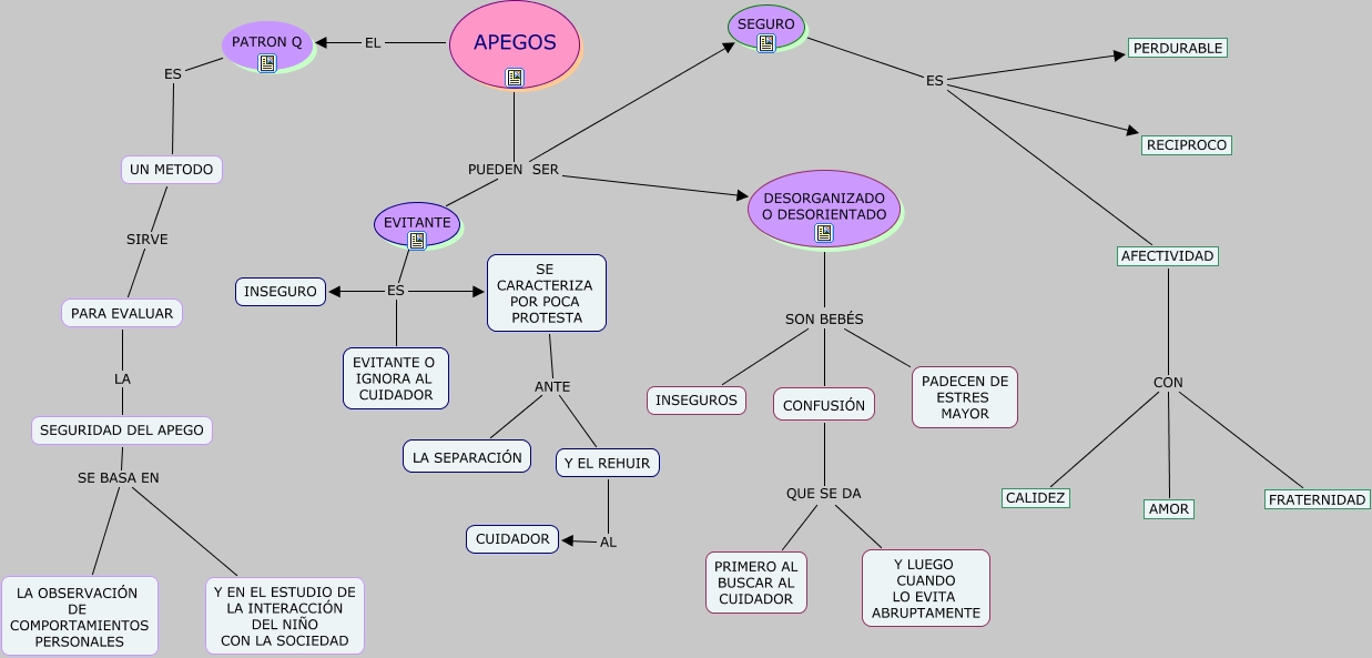 Este Cmap, tiene información relacionada con: APEGOS, EVITANTE ES INSEGURO, APEGOS PUEDEN SER DESORGANIZADO O DESORIENTADO, DESORGANIZADO O DESORIENTADO SON BEBÉS INSEGUROS, SE CARACTERIZA POR POCA PROTESTA ANTE Y EL REHUIR, Y EL REHUIR AL CUIDADOR, EVITANTE ES SE CARACTERIZA POR POCA PROTESTA, SEGURO ES AFECTIVIDAD, DESORGANIZADO O DESORIENTADO SON BEBÉS CONFUSIÓN, SEGURIDAD DEL APEGO SE BASA EN Y EN EL ESTUDIO DE LA INTERACCIÓN DEL NIÑO CON LA SOCIEDAD, PARA EVALUAR LA SEGURIDAD DEL APEGO, AFECTIVIDAD CON AMOR, SEGURO ES PERDURABLE, CONFUSIÓN QUE SE DA Y LUEGO CUANDO LO EVITA ABRUPTAMENTE, CONFUSIÓN QUE SE DA PRIMERO AL BUSCAR AL CUIDADOR, UN METODO SIRVE PARA EVALUAR, EVITANTE ES EVITANTE O IGNORA AL CUIDADOR, PATRON Q ES UN METODO, AFECTIVIDAD CON CALIDEZ, SEGURIDAD DEL APEGO SE BASA EN LA OBSERVACIÓN DE COMPORTAMIENTOS PERSONALES, SEGURO ES RECIPROCO