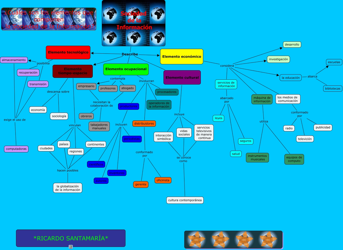 Este Cmap, tiene información relacionada con: sociedad de la información, Elemento económico considera los medios de comunicación, Elemento tiempo-espacio descansa sobre sociología, Elemento ocupacional involucran procesadores, Elemento cultural incluye servicios televisivos de manera continua, Elemento tiempo-espacio descansa sobre economía, productores incluyen cientìficos, Elemento cultural incluye vidas sociales, abogado necesitan la colaboración de tabajadores manuales, servicios de información abarcado por leyes, ciudades hacen posibles la globalización de la información, Elemento tiempo-espacio vinculan regiones, servicios televisivos de manera continua se conoce como cultura contemporánea, la educación abarca bibliotecas, Elemento económico considera servicios de información, Elemento tiempo-espacio vinculan ciudades, interacción simbólica se conoce como cultura contemporánea, Elemento ocupacional involucran operadores de la información, almacenamiento exige el uso de computadoras, Sociedad de la Información Describe Elemento ocupacional, transmisión exige el uso de computadoras