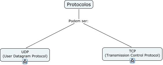 Esse mapa conceitual, produzido no IHMC CmapTools, tem a informação relacionada a: Protocolos, Protocolos Podem ser: UDP (User Datagram Protocol), Protocolos Podem ser: TCP (Transmission Control Protocol)