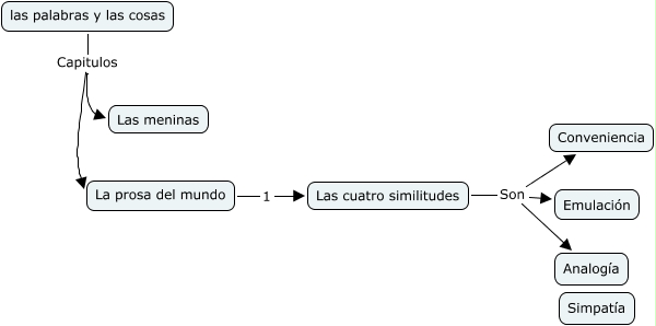 Este Cmap, tiene información relacionada con: Las palabras y las cosas, La prosa del mundo 1 Las cuatro similitudes, Las cuatro similitudes Son Analogía, Las cuatro similitudes Son Emulación, Las cuatro similitudes Son Conveniencia, las palabras y las cosas Capitulos Las meninas, las palabras y las cosas Capitulos La prosa del mundo
