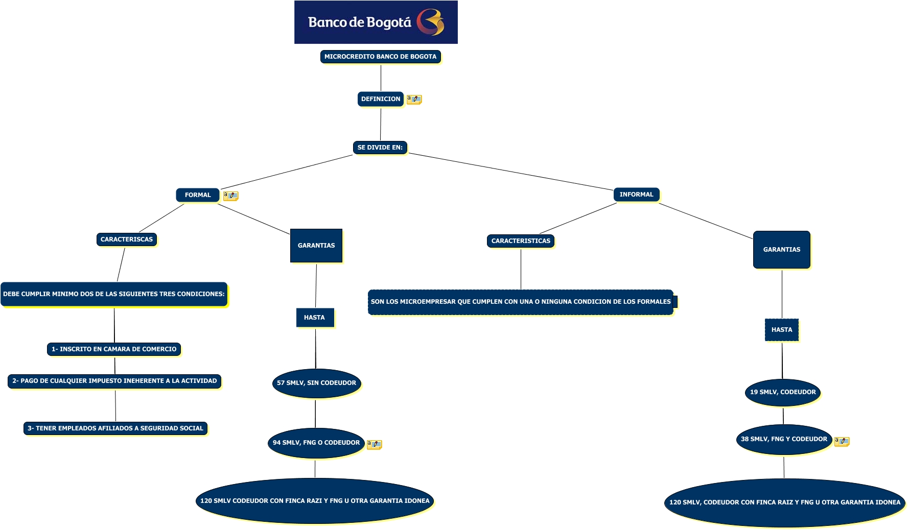 Este Cmap, tiene información relacionada con: MICROCREDITO, CARACTERISCAS DEBE CUMPLIR MINIMO DOS DE LAS SIGUIENTES TRES CONDICIONES: 3- TENER EMPLEADOS AFILIADOS A SEGURIDAD SOCIAL, CARACTERISCAS DEBE CUMPLIR MINIMO DOS DE LAS SIGUIENTES TRES CONDICIONES: 2- PAGO DE CUALQUIER IMPUESTO INEHERENTE A LA ACTIVIDAD, GARANTIAS HASTA 94 SMLV, FNG O CODEUDOR, CARACTERISCAS DEBE CUMPLIR MINIMO DOS DE LAS SIGUIENTES TRES CONDICIONES: 1- INSCRITO EN CAMARA DE COMERCIO, SE DIVIDE EN: FORMAL CARACTERISCAS, MICROCREDITO BANCO DE BOGOTA DEFINICION SE DIVIDE EN:, GARANTIAS HASTA 120 SMLV CODEUDOR CON FINCA RAZI Y FNG U OTRA GARANTIA IDONEA, GARANTIAS HASTA 38 SMLV, FNG Y CODEUDOR, CARACTERISTICAS SON LOS MICROEMPRESAR QUE CUMPLEN CON UNA O NINGUNA CONDICION DE LOS FORMALES, GARANTIAS HASTA 19 SMLV, CODEUDOR, GARANTIAS HASTA 57 SMLV, SIN CODEUDOR, GARANTIAS HASTA 120 SMLV, CODEUDOR CON FINCA RAIZ Y FNG U OTRA GARANTIA IDONEA, SE DIVIDE EN: INFORMAL CARACTERISTICAS, SE DIVIDE EN: FORMAL GARANTIAS, SE DIVIDE EN: INFORMAL GARANTIAS