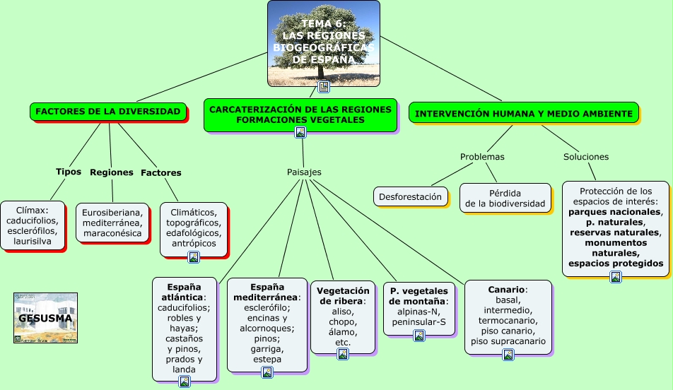 Este Cmap, tiene información relacionada con: Tema 6 Las regiones biogeográficas, TEMA 6: LAS REGIONES BIOGEOGRÁFICAS DE ESPAÑA ???? CARCATERIZACIÓN DE LAS REGIONES FORMACIONES VEGETALES, INTERVENCIÓN HUMANA Y MEDIO AMBIENTE Soluciones Protección de los espacios de interés: parques nacionales, p. naturales, reservas naturales, monumentos naturales, espacios protegidos, CARCATERIZACIÓN DE LAS REGIONES FORMACIONES VEGETALES Paisajes España atlántica: caducifolios; robles y hayas; castaños y pinos, prados y landa, FACTORES DE LA DIVERSIDAD Factores Climáticos, topográficos, edafológicos, antrópicos, CARCATERIZACIÓN DE LAS REGIONES FORMACIONES VEGETALES Paisajes España mediterránea: esclerófilo; encinas y alcornoques; pinos; garriga, estepa, INTERVENCIÓN HUMANA Y MEDIO AMBIENTE Problemas Desforestación, TEMA 6: LAS REGIONES BIOGEOGRÁFICAS DE ESPAÑA ???? INTERVENCIÓN HUMANA Y MEDIO AMBIENTE, INTERVENCIÓN HUMANA Y MEDIO AMBIENTE Problemas Pérdida de la biodiversidad, CARCATERIZACIÓN DE LAS REGIONES FORMACIONES VEGETALES Paisajes Vegetación de ribera: aliso, chopo, álamo, etc., TEMA 6: LAS REGIONES BIOGEOGRÁFICAS DE ESPAÑA ???? FACTORES DE LA DIVERSIDAD, CARCATERIZACIÓN DE LAS REGIONES FORMACIONES VEGETALES Paisajes Canario: basal, intermedio, termocanario, piso canario, piso supracanario, CARCATERIZACIÓN DE LAS REGIONES FORMACIONES VEGETALES Paisajes P. vegetales de montaña: alpinas-N, peninsular-S, FACTORES DE LA DIVERSIDAD Tipos Clímax: caducifolios, esclerófilos, laurisilva, FACTORES DE LA DIVERSIDAD Regiones Eurosiberiana, mediterránea, maraconésica