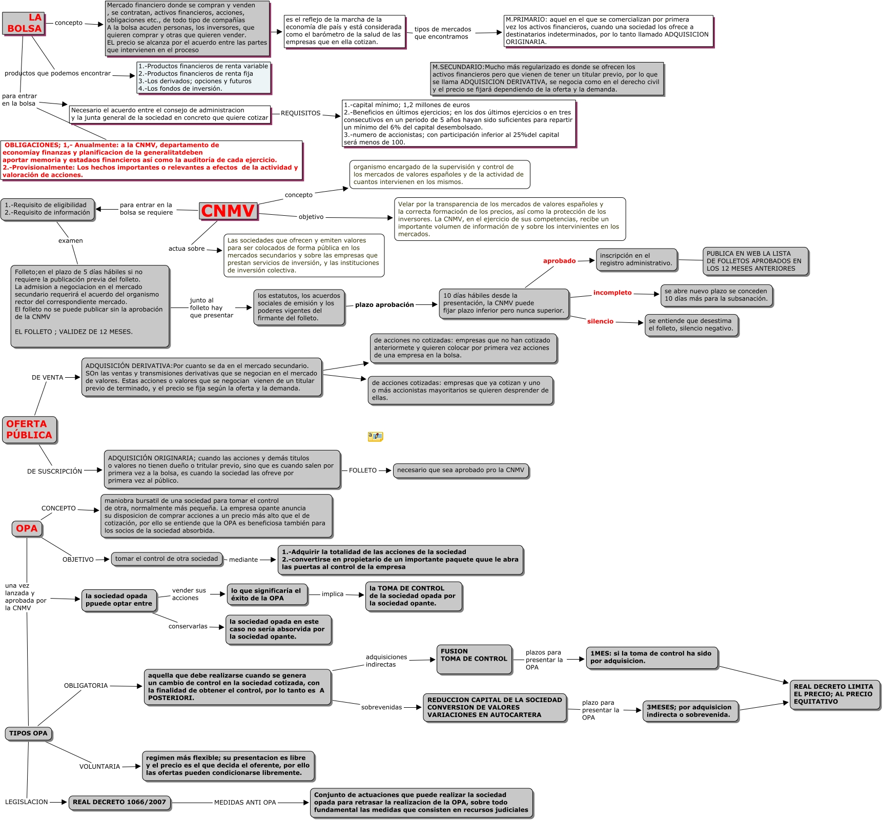 Este Cmap, tiene información relacionada con: LA BOLA CASO 9, OFERTA PÚBLICA DE VENTA ADQUISICIÓN DERIVATIVA:Por cuanto se da en el mercado secundario. SOn las ventas y transmisiones derivativas que se negocian en el mercado de valores. Estas acciones o valores que se negocian vienen de un titular previo de terminado, y el precio se fija según la oferta y la demanda., aquella que debe realizarse cuando se genera un cambio de control en la sociedad cotizada, con la finalidad de obtener el control, por lo tanto es A POSTERIORI. sobrevenidas REDUCCION CAPITAL DE LA SOCIEDAD CONVERSION DE VALORES VARIACIONES EN AUTOCARTERA, 3MESES; por adquisicion indirecta o sobrevenida. ???? REAL DECRETO LIMITA EL PRECIO; AL PRECIO EQUITATIVO, TIPOS OPA OBLIGATORIA aquella que debe realizarse cuando se genera un cambio de control en la sociedad cotizada, con la finalidad de obtener el control, por lo tanto es A POSTERIORI., TIPOS OPA LEGISLACION REAL DECRETO 1066/2007, ADQUISICIÓN ORIGINARIA; cuando las acciones y demás titulos o valores no tienen dueño o tritular previo, sino que es cuando salen por primera vez a la bolsa, es cuando la sociedad las ofreve por primera vez al público. FOLLETO necesario que sea aprobado pro la CNMV, OPA una vez lanzada y aprobada por la CNMV TIPOS OPA, 1MES: si la toma de control ha sido por adquisicion. ???? REAL DECRETO LIMITA EL PRECIO; AL PRECIO EQUITATIVO, FUSION TOMA DE CONTROL plazos para presentar la OPA 1MES: si la toma de control ha sido por adquisicion., OPA una vez lanzada y aprobada por la CNMV la sociedad opada ppuede optar entre, inscripción en el registro administrativo. ???? ????, la sociedad opada ppuede optar entre conservarlas la sociedad opada en este caso no sería absorvida por la sociedad opante., los estatutos, los acuerdos sociales de emisión y los poderes vigentes del firmante del folleto. plazo aprobación 10 días hábiles desde la presentación, la CNMV puede fijar plazo inferior pero nunca superior., OPA OBJETIVO tomar el control de otra sociedad, aquella que debe realizarse cuando se genera un cambio de control en la sociedad cotizada, con la finalidad de obtener el control, por lo tanto es A POSTERIORI. adquisiciones indirectas FUSION TOMA DE CONTROL, 10 días hábiles desde la presentación, la CNMV puede fijar plazo inferior pero nunca superior. silencio se entiende que desestima el folleto, silencio negativo., CNMV actua sobre Las sociedades que ofrecen y emiten valores para ser colocados de forma pública en los mercados secundarios y sobre las empresas que prestan servicios de inversión, y las instituciones de inversión colectiva., LA BOLSA productos que podemos encontrar 1.-Productos financieros de renta variable 2.-Productos financieros de renta fija 3.-Los derivados; opciones y futuros 4.-Los fondos de inversión., LA BOLSA para entrar en la bolsa OBLIGACIONES; 1,- Anualmente: a la CNMV, departamento de economíay finanzas y planificacion de la generalitatdeben aportar memoria y estadaos financieros así como la auditoría de cada ejercicio. 2.-Provisionalmente: Los hechos importantes o relevantes a efectos de la actividad y valoración de acciones., 1.-Requisito de eligibilidad 2.-Requisito de información examen Folleto;en el plazo de 5 días hábiles si no requiere la publicación previa del folleto. La admision a negociacion en el mercado secundario requerirá el acuerdo del organismo rector del correspondiente mercado. El folleto no se puede publicar sin la aprobación de la CNMV EL FOLLETO ; VALIDEZ DE 12 MESES.