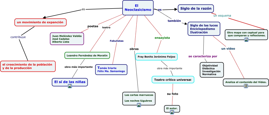 Este Cmap, tiene información relacionada con: SigloXVIII, El Neoclasicismo es un movimiento de expanción, El Neoclasicismo teatro Leandro Fernández de Moratín, un movimiento de expanción contribuye el creecimiento de la población y de la producción, El Neoclasicismo ensayista Fray Benito Jerónimo Feijoo, El Neoclasicismo es Siglo de la razón, Siglo de la razón un esquema Otro mapa con ceptual para que compares y reflexiones., Teatro crítico universal su foto El autor., Siglo de las luces Enciclopedismo Ilustración se caracteriza por Objetividad Didáctica Investigación Normativa, El Neoclasicismo también Siglo de las luces Enciclopedismo Ilustración, Fray Benito Jerónimo Feijoo obra más importante Teatro crítico universal, Leandro Fernández de Moratín obra más importante El sí de las niñas, Siglo de las luces Enciclopedismo Ilustración un vídeo Analiza el contenido del Vídeo., El Neoclasicismo Fabulistas Tomás Iriarte Félix Ma. Samaniego, El Neoclasicismo obras Las cartas marruecas Las noches lúgubres, El Neoclasicismo poetas Juan Meléndez Valdés José Cadalso Alberto Lista