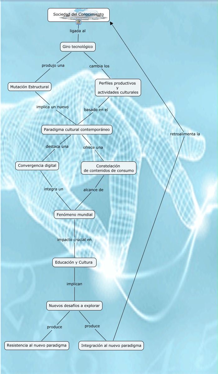 Este Cmap, tiene información relacionada con: Sociedad del conocimiento, Mutación Estructural implica un nuevo Paradigma cultural contemporáneo, Educación y Cultura implican Nuevos desafíos a explorar, Sociedad del Conocimiento ligada al Giro tecnológico, Nuevos desafíos a explorar produce Resistencia al nuevo paradigma, Fenómeno mundial impacto crucial en Educación y Cultura, Perfiles productivos y actividades culturales basado en el Paradigma cultural contemporáneo, Giro tecnológico cambia los Perfiles productivos y actividades culturales, Paradigma cultural contemporáneo ofrece una Constelación de contenidos de consumo, Giro tecnológico produjo una Mutación Estructural, Paradigma cultural contemporáneo destaca una Convergencia digital, Integración al nuevo paradigma retroalimenta la Sociedad del Conocimiento, Constelación de contenidos de consumo alcance de Fenómeno mundial, Nuevos desafíos a explorar produce Integración al nuevo paradigma, Convergencia digital integra un Fenómeno mundial