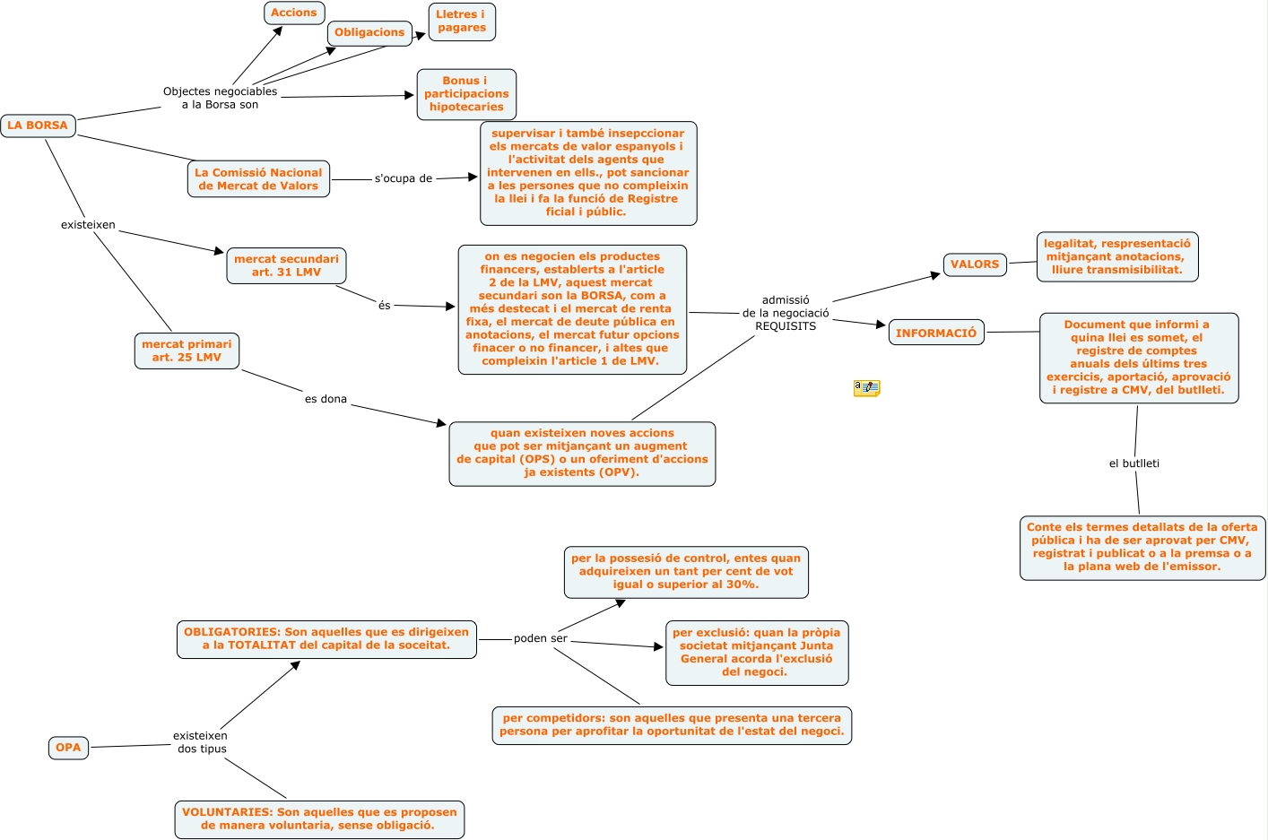 Este Cmap, tiene información relacionada con: La Borsa Escenari 9, quan existeixen noves accions que pot ser mitjançant un augment de capital (OPS) o un oferiment d'accions ja existents (OPV). admissió de la negociació REQUISITS INFORMACIÓ, Document que informi a quina llei es somet, el registre de comptes anuals dels últims tres exercicis, aportació, aprovació i registre a CMV, del butlleti. el butlleti Conte els termes detallats de la oferta pública i ha de ser aprovat per CMV, registrat i publicat o a la premsa o a la plana web de l'emissor., LA BORSA Objectes negociables a la Borsa son Accions, on es negocien els productes financers, establerts a l'article 2 de la LMV, aquest mercat secundari son la BORSA, com a més destecat i el mercat de renta fixa, el mercat de deute pública en anotacions, el mercat futur opcions finacer o no financer, i altes que compleixin l'article 1 de LMV. admissió de la negociació REQUISITS VALORS, LA BORSA Objectes negociables a la Borsa son Bonus i participacions hipotecaries, mercat secundari art. 31 LMV és on es negocien els productes financers, establerts a l'article 2 de la LMV, aquest mercat secundari son la BORSA, com a més destecat i el mercat de renta fixa, el mercat de deute pública en anotacions, el mercat futur opcions finacer o no financer, i altes que compleixin l'article 1 de LMV., quan existeixen noves accions que pot ser mitjançant un augment de capital (OPS) o un oferiment d'accions ja existents (OPV). admissió de la negociació REQUISITS VALORS, OBLIGATORIES: Son aquelles que es dirigeixen a la TOTALITAT del capital de la soceitat. poden ser per la possesió de control, entes quan adquireixen un tant per cent de vot igual o superior al 30%., La Comissió Nacional de Mercat de Valors s'ocupa de supervisar i també insepccionar els mercats de valor espanyols i l'activitat dels agents que intervenen en ells., pot sancionar a les persones que no compleixin la llei i fa la funció de Registre ficial i públic., OBLIGATORIES: Son aquelles que es dirigeixen a la TOTALITAT del capital de la soceitat. poden ser per exclusió: quan la pròpia societat mitjançant Junta General acorda l'exclusió del negoci., OPA existeixen dos tipus OBLIGATORIES: Son aquelles que es dirigeixen a la TOTALITAT del capital de la soceitat., LA BORSA existeixen mercat primari art. 25 LMV, LA BORSA ???? La Comissió Nacional de Mercat de Valors, LA BORSA Objectes negociables a la Borsa son Obligacions, OBLIGATORIES: Son aquelles que es dirigeixen a la TOTALITAT del capital de la soceitat. poden ser per competidors: son aquelles que presenta una tercera persona per aprofitar la oportunitat de l'estat del negoci., LA BORSA Objectes negociables a la Borsa son Lletres i pagares, VALORS Son requisits legalitat, respresentació mitjançant anotacions, lliure transmisibilitat., INFORMACIÓ ???? Document que informi a quina llei es somet, el registre de comptes anuals dels últims tres exercicis, aportació, aprovació i registre a CMV, del butlleti., OPA existeixen dos tipus VOLUNTARIES: Son aquelles que es proposen de manera voluntaria, sense obligació., mercat primari art. 25 LMV es dona quan existeixen noves accions que pot ser mitjançant un augment de capital (OPS) o un oferiment d'accions ja existents (OPV).