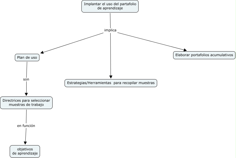 Este Cmap, tiene información relacionada con: Implantar portafolio aprendizaje, Directrices para seleccionar muestras de trabajo en función objetivos de aprendizaje, Implantar el uso del partafolio de aprendizaje implica Estrategias/Herramientas para recopilar muestras, Implantar el uso del partafolio de aprendizaje implica Plan de uso, Implantar el uso del partafolio de aprendizaje implica Elaborar portafolios acumulativos, Plan de uso son Directrices para seleccionar muestras de trabajo