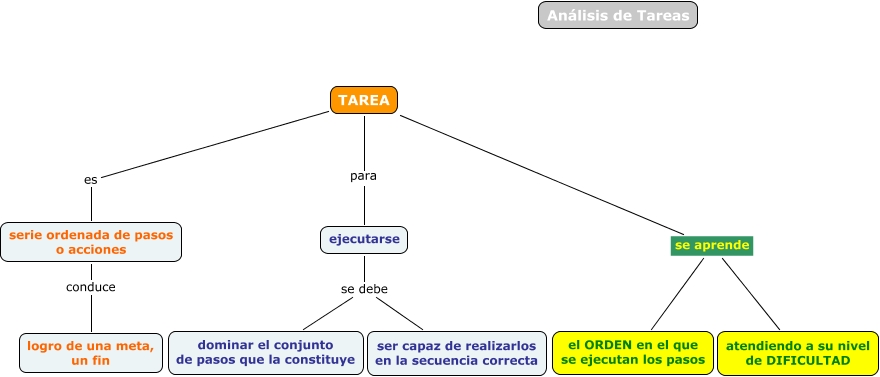 Questa Cmap, creata con IHMC CmapTools, contiene informazioni relative a: analisis_tareas, TAREA se aprende atendiendo a su nivel de DIFICULTAD, serie ordenada de pasos o acciones conduce logro de una meta, un fin, TAREA se aprende el ORDEN en el que se ejecutan los pasos, ejecutarse se debe ser capaz de realizarlos en la secuencia correcta, TAREA es serie ordenada de pasos o acciones, TAREA para ejecutarse, ejecutarse se debe dominar el conjunto de pasos que la constituye