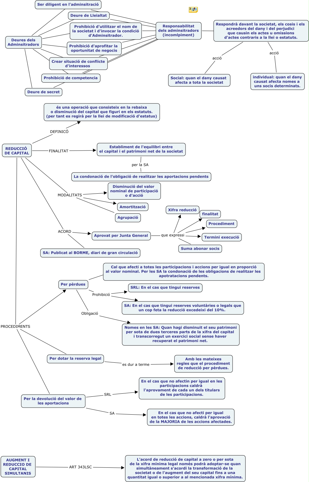 Este Cmap, tiene información relacionada con: Reducció de capital 10, Per la devolució del valor de les aportacions SA En el cas que no afecti per igual en totes les accions, caldrà l'aprovació de la MAJORIA de les accions afectades., REDUCCIÓ DE CAPITAL PROCEDIMENTS Per la devolució del valor de les aportacions, Ser diligent en l'adminsitració ???? Responsabilitat dels adminsitradors (incomlpiment), AUGMENT I REDUCCIO DE CAPITAL SIMULTANIS ART 343LSC L'acord de reducció de capital a zero o per sota de la xifra mínima legal només podrà adoptar-se quan simultàneament s'acordi la transformació de la societat o de l'augment del seu capital fins a una quantitat igual o superior a al mencionada xifra mínima., Prohibició d'aprofitar la oportunitat de negocis ???? Responsabilitat dels adminsitradors (incomlpiment), Respondrà davant la societat, els cosis i els acreedors del dany i del perjudici que causin els actes u omissions d'actes contraris a la llei o estatuts. acció individual: quan el dany causat afecta nomes a uns socis determinats., Respondrà davant la societat, els cosis i els acreedors del dany i del perjudici que causin els actes u omissions d'actes contraris a la llei o estatuts. acció Social: quan el dany causat afecta a tota la societat, REDUCCIÓ DE CAPITAL DEFINICÓ és una operació que consisteix en la rebaixa o disminució del capital que figuri en els estatuts. (per tant es regirà per la llei de modificació d'estatus), Deures dels Adminsitradors ???? Deure de secret, REDUCCIÓ DE CAPITAL ACORD SA: Publicat al BORME, diari de gran circulació, Aprovat per Junta General que expressi Suma abonar socis, Per pèrdues ???? Cal que afecti a totes les participacions i accions per igual en proporció al valor nominal. Per les SA la condonació de les obligacions de realitzar les apotratacions pendents., Deures dels Adminsitradors ???? Prohibició d'aprofitar la oportunitat de negocis, Aprovat per Junta General que expressi Xifra reducció, Deures dels Adminsitradors ???? Crear situació de conflicte d'interessos, Prohibició d'utilitzar el nom de la societat i d'invocar la condició d'Adminsitrador. ???? Responsabilitat dels adminsitradors (incomlpiment), Aprovat per Junta General que expressi Procediment, REDUCCIÓ DE CAPITAL MODALITATS Amortització, REDUCCIÓ DE CAPITAL MODALITATS Disminució del valor nominal de participació o d'acció, Aprovat per Junta General que expressi Termini execució