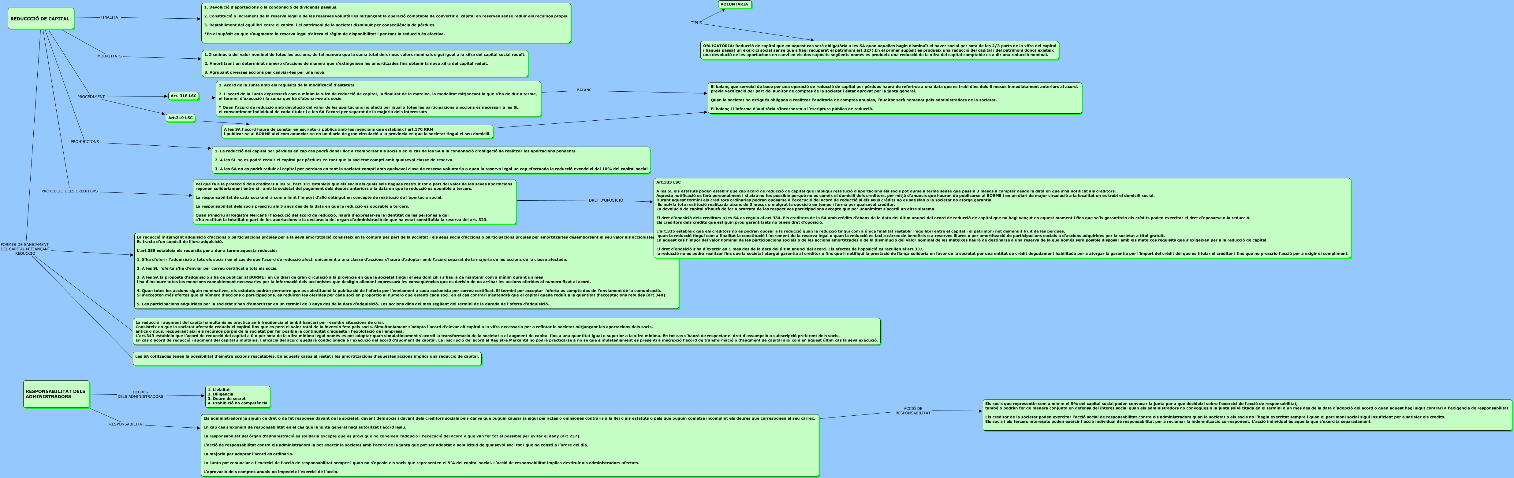 Este Cmap, tiene información relacionada con: ESCENARI 10 MERCANTIL II, Art.319 LSC ???? A les SA l'acord haurà de constar en escriptura pública amb les mencions que estableix l’art.170 RRM i publicar-se al BORME així com anunciar-se en un diaria de gran circulació a la província en que la societat tingui el seu domicili., 1. Devolució d’aportacions o la condonació de dividends passius. 2. Constitució o increment de la reserva legal o de les reserves voluntàries mitjançant la operació comptable de convertir el capital en reserves sense reduir els recursos propis. 3. Restabliment del equilibri entre el capital i el patrimoni de la societat disminuït per conseqüència de pèrdues. *En el supòsit en que s’augmenta la reserva legal s’altera el règim de disponibilitat i per tant la reducció és efectiva. TIPUS OBLIGATÒRIA: Reducció de capital que en aquest cas serà obligatòria a les SA quan aquelles hagin disminuït el haver social per sota de les 2/3 parts de la xifra del capital i hagués passat un exercici social sense que s’hagi recuperat el patrimoni art.327).En el primer supòsit es produeix una reducció del capital i del patrimoni doncs existeix una devolució de les aportacions en canvi en els dos supòsits següents només es produeix una reducció de la xifra del capital comptable es a dir una reducció nominal., REDUCCCIÓ DE CAPITAL PROCEDIMENT Art. 318 LSC, RESPONSABILITAT DELS ADMINISTRADORS RESPONSABILITAT Els administradors ja siguin de dret o de fet responen davant de la societat, davant dels socis i davant dels creditors socials pels danys que puguin causar ja sigui per actes o omisiones contraris a la llei o als estatuts o pels que puguin cometre incomplint els deures que corresponen al seu càrrec. En cap cas s’exonera de responsabilitat en el cas que la junta general hagi autoritzat l’acord lesiu. La responsabilitat del òrgan d’administració es solidaria excepte que es provi que no coneixen l’adopció i l’execució del acord o que van fer tot el possible per evitar el dany (art.237). L’acció de responsabilitat contra els administradors la pot exercir la societat amb l’acord de la junta que pot ser adoptat a sol•licitud de qualsevol soci tot i que no consti a l’ordre del dia. La majoria per adoptar l’acord es ordinaria. La Junta pot renunciar a l’exercici de l’acció de responsabilitat sempre i quan no s’oposin els socis que representen el 5% del capital social. L’acció de responsabilitat implica destituir als administradors afectats. L’aprovació dels comptes anuals no impedeix l’exercici de l’acció., REDUCCCIÓ DE CAPITAL FORMES DE SANEJAMENT DEL CAPITAL MITJANÇANT REDUCCIÓ La reducció mitjançant adquisició d’accions o participacions pròpies per a la seva amortització consisteix en la compra per part de la societat i els seus socis d’accions o participacions propies per amortitzarles desemborsant el seu valor als accionistes venedors. Es tracta d’un supòsit de lliure adquisició. L’art.338 estableix els requisits per a dur a terme aquesta reducció: 1. S’ha d’oferir l’adquisició a tots els socis i en el cas de que l’acord de reducció afecti únicament a una classe d’accions s’haurà d’adoptar amb l’acord separat de la majoria de les accions de la classe afectada. 2. A les SL l’oferta s’ha d’enviar per correu certificat a tots els socis. 3. A les SA la proposta d’adquisició s’ha de publicar al BORME i en un diari de gran circulació a la provincia en que la societat tingui el seu domicili i s’haurà de mantenir com a mínim durant un mes i ha d’incloure totes les mencions raonablement necessaries per la informació dels accionistes que desitgin alienar i expressarà les conseqüències que es derivin de no arribar les accions oferides al numero fixat al acord. 4. Quan totes les accions siguin nominatives, els estatuts podràn permetre que es substitueixi la publicació de l’oferta per l’enviament a cada accionista per correu certificat. El termini per acceptar l’oferta es compte des de l’enviament de la comunicació. Si s’accepten més ofertes que el número d’accions o participacions, es reduïren les oferides per cada soci en proporcio al numero que ostenti cada soci, en el cas contrari s’entendrà que el capital queda reduït a la quantitat d’acceptacions rebudes (art.340). 5. Les participacions adquirides per la societat s’han d’amortitzar en un termini de 3 anys des de la data d’adquisició. Les accions dins del mes següent del termini de la durada de l’oferta d’adquisició., RESPONSABILITAT DELS ADMINISTRADORS DEURES DELS ADMINISTRADORS 1. Lleialtat 2. Diligencia 3. Deure de secret 4. Prohibició no competència, REDUCCCIÓ DE CAPITAL MODALITATS 1.Disminució del valor nominal de totes les accions, de tal manera que la suma total dels nous valors nominals sigui igual a la xifra del capital social reduït. 2. Amortitzant un determinat número d’accions de manera que s’extingeixen les amortitzades fins obtenir la nova xifra del capital reduït. 3. Agrupant diverses accions per canviar-les per una nova., 1. Acord de la Junta amb els requisits de la modificació d'estatuts. 2. L’acord de la Junta expressarà com a mínim la xifra de reducció de capital, la finalitat de la mateixa, la modalitat mitjançant la que s’ha de dur a terme, el termini d’execució i la suma que ha d’abonar-se als socis. * Quan l’acord de reducció amb devolució del valor de les aportacions no afecti per igual a totes les participacions o accions és necessari a les SL el consentiment individual de cada titular i a les SA l’acord per separat de la majoria dels interessats BALANÇ El balanç que serveixi de base per una operació de reducció de capital per pèrdues haurà de referirse a una data que es trobi dins dels 6 mesos inmediatament anteriors al acord, previa verificació per part del auditor de comptes de la societat i estar a