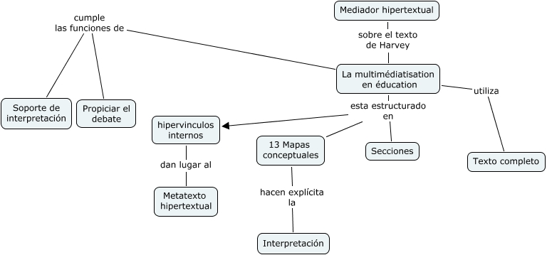 Este Cmap, tiene información relacionada con: La multimédiatisation en éducation, La multimédiatisation en éducation esta estructurado en 13 Mapas conceptuales, hipervinculos internos dan lugar al Metatexto hipertextual, La multimédiatisation en éducation esta estructurado en hipervinculos internos, La multimédiatisation en éducation cumple las funciones de Soporte de interpretación, Mediador hipertextual sobre el texto de Harvey La multimédiatisation en éducation, 13 Mapas conceptuales hacen explícita la Interpretación, La multimédiatisation en éducation utiliza Texto completo, La multimédiatisation en éducation cumple las funciones de Propiciar el debate, La multimédiatisation en éducation esta estructurado en Secciones