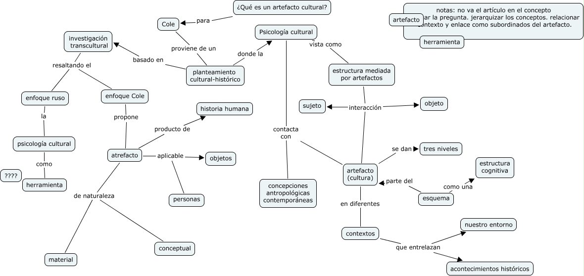 Este Cmap, tiene información relacionada con: Psicología Cultural, esquema como una estructura cognitiva, planteamiento cultural-histórico basado en investigación transcultural, atrefacto producto de historia humana, Psicología cultural contacta con artefacto (cultura), enfoque ruso la psicología cultural, atrefacto aplicable objetos, atrefacto de naturaleza material, ¿Qué es un artefacto cultural? para Cole, estructura mediada por artefactos interacción sujeto, psicología cultural como herramienta, artefacto ???? herramienta, investigación transcultural resaltando el enfoque Cole, artefacto (cultura) en diferentes contextos, estructura mediada por artefactos interacción objeto, planteamiento cultural-histórico donde la Psicología cultural, investigación transcultural resaltando el enfoque ruso, Cole proviene de un planteamiento cultural-histórico, contextos que entrelazan acontecimientos históricos, atrefacto aplicable personas, contextos que entrelazan nuestro entorno
