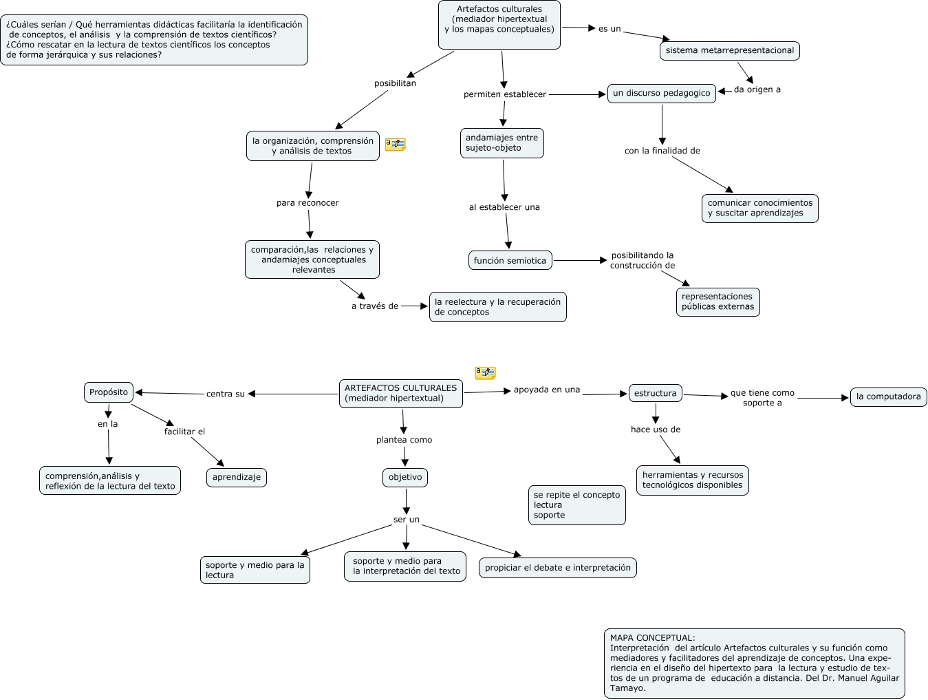 Este Cmap, tiene información relacionada con: Sin Título 1artefactos culturales y su función como mediadores del aprendizaje, comparación,las relaciones y andamiajes conceptuales relevantes a través de la reelectura y la recuperación de conceptos, ARTEFACTOS CULTURALES (mediador hipertextual) plantea como objetivo, ARTEFACTOS CULTURALES (mediador hipertextual) apoyada en una estructura, Artefactos culturales (mediador hipertextual y los mapas conceptuales) es un sistema metarrepresentacional, objetivo ser un soporte y medio para la interpretación del texto, estructura hace uso de herramientas y recursos tecnológicos disponibles, objetivo ser un soporte y medio para la lectura, estructura que tiene como soporte a la computadora, objetivo ser un propiciar el debate e interpretación, la organización, comprensión y análisis de textos para reconocer comparación,las relaciones y andamiajes conceptuales relevantes, Artefactos culturales (mediador hipertextual y los mapas conceptuales) posibilitan la organización, comprensión y análisis de textos, andamiajes entre sujeto-objeto al establecer una función semiotica, Propósito en la comprensión,análisis y reflexión de la lectura del texto, Propósito facilitar el aprendizaje, un discurso pedagogico con la finalidad de comunicar conocimientos y suscitar aprendizajes, Artefactos culturales (mediador hipertextual y los mapas conceptuales) permiten establecer andamiajes entre sujeto-objeto, función semiotica posibilitando la construcción de representaciones públicas externas, sistema metarrepresentacional da origen a un discurso pedagogico, ARTEFACTOS CULTURALES (mediador hipertextual) centra su Propósito, Artefactos culturales (mediador hipertextual y los mapas conceptuales) permiten establecer un discurso pedagogico