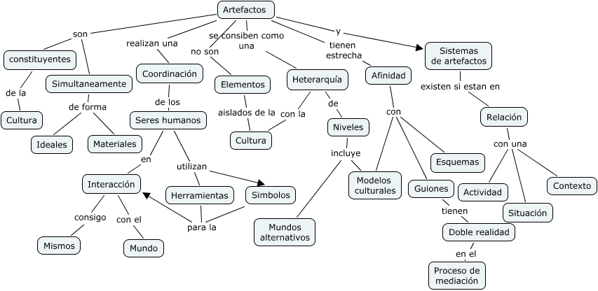 Este Cmap, tiene información relacionada con: 4ta. lactura. Artefactos culturales, Artefactos se consiben como una Heterarquía, Simultaneamente de forma Materiales, Interacción con el Mundo, Afinidad con Modelos culturales, constituyentes de la Cultura, Simbolos para la Interacción, Relación con una Contexto, Niveles incluye Mundos alternativos, Artefactos son constituyentes, Heterarquía con la Cultura, Artefactos no son Elementos, Doble realidad en el Proceso de mediación, Simultaneamente de forma Ideales, Guiones tienen Doble realidad, Seres humanos utilizan Simbolos, Afinidad con Esquemas, Artefactos realizan una Coordinación, Relación con una Actividad, Afinidad con Guiones, Artefactos son Simultaneamente